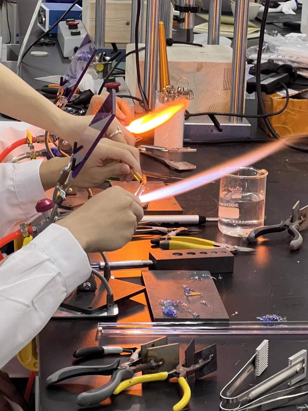 这门课真的很不错!班上同学都特别好相处,大家经常互相帮忙、分享经验,老师也特别负责,时刻关注着每个人的进度,发现问题就马上过来指导。最有意思的是能自己动手烧制玻璃!从设计造型到塑形烧制,每一步都能自己掌控,想做杯子、摆件都行。把做好的玻璃制品拿到阳光下,看它折射出亮晶晶的光,真的超有满足感,强烈推荐大家来体验!