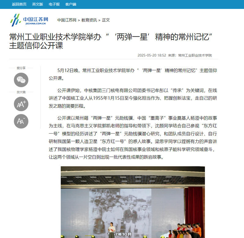 中国江苏网:常州工业职业技术学院举办“‘两弹一星’精神的常州记忆”主题信仰公开课