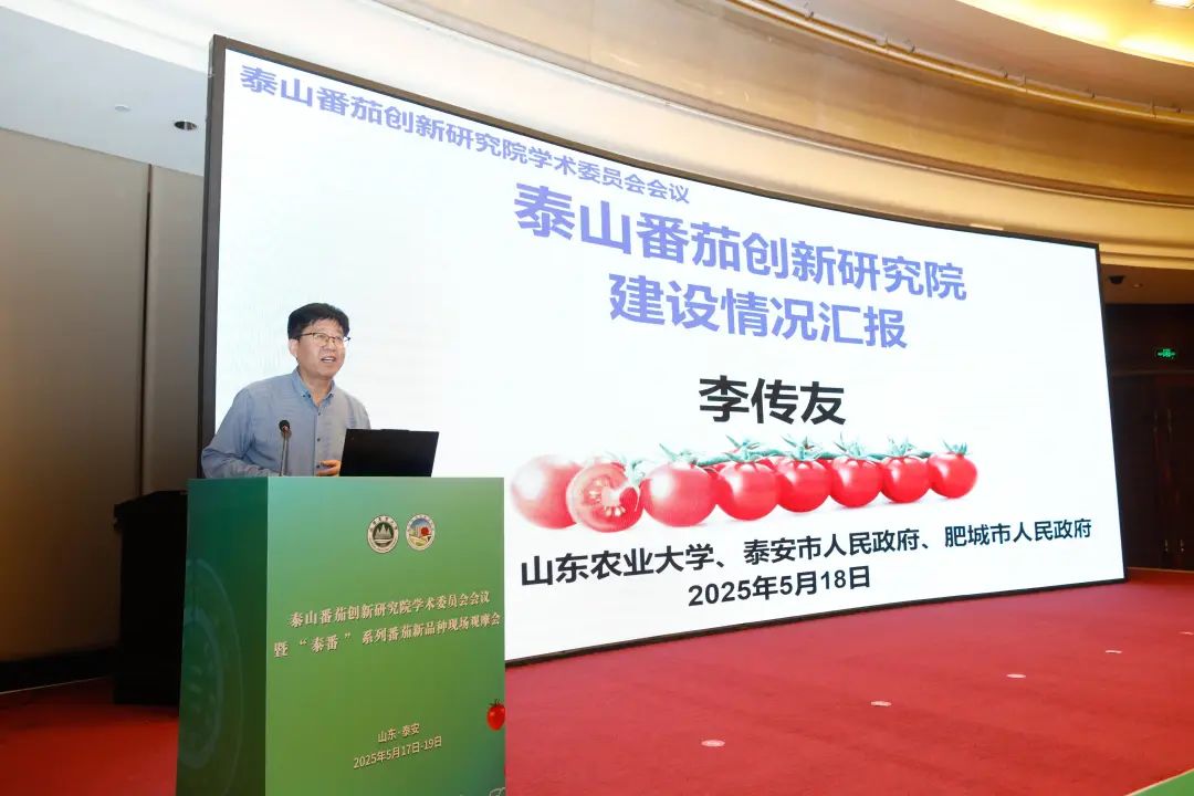 5月17日至19日,泰山番茄创新研究院学术委员会会议暨“泰番”系列番茄新品种现场观摩会在泰安召开。中国工程院院士、沈阳农业大学教授李天来,中国工程院院士、宁波大学教授陈剑平,中国工程院院士、湖南农业大学校长邹学校,中国工程院院士、浙江大学教授喻景权,中国园艺学会名誉理事长、中国农业科学院蔬菜花卉研究所研究员杜永臣,中国农业科学院蔬菜花卉研究所所长张友军等学术委员会成员齐聚一堂,共商泰山番茄创新研究院发展大计。山东农业大学党委副书记、校长冷畅俭,山东省农业农村厅党组成员、副厅长周团结,泰安市委副书记、政法委书记马广峰,泰安市人民政府党组成员、副市长马保文等出席会议。山东农业大学党委常委、副校长王勇主持会议。