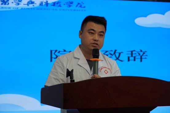 护理学院副院长吴安强发表致辞,对过去一年时间里护理学院从学生获奖、教学改革、学院发展等进行报告,对老师同学们的付出表示感谢,深情寄语全体护理学子要懂得感恩,并勉励他们坚定自我、仁心济世。