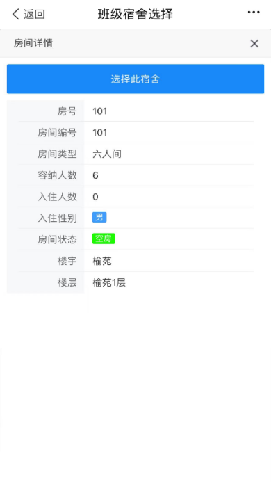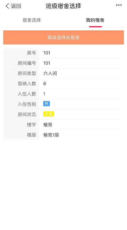 2.宿舍选择后,可在“我的宿舍”菜单中查看具体房间信息;