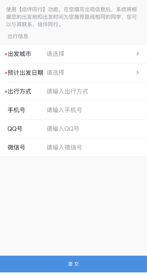 1.新生可根据个人需要填写出行信息,系统将根据您的出发地和出发时间为您推荐路线相同的同学,您可以与其联系,结伴同行;