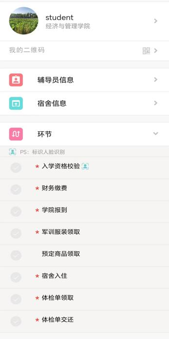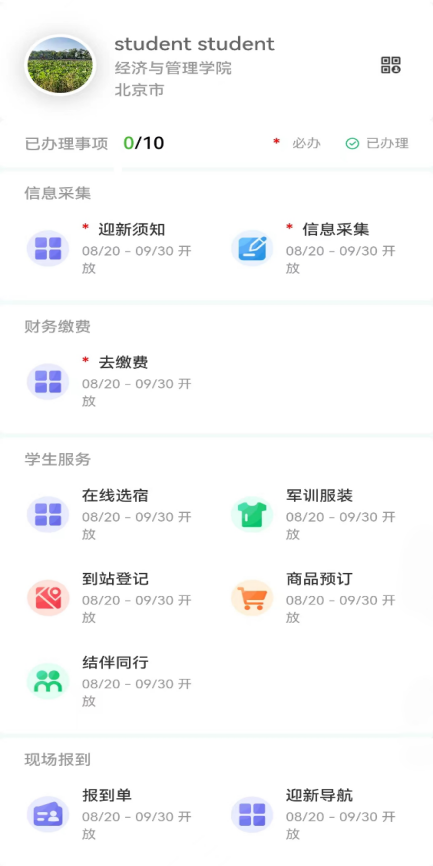 线上迎新展示环节共计10项,需要完成线上办理的8项,其中标有※号的为必办项,其余为非必办项,剩余2项用于现场到校后的办理指引。