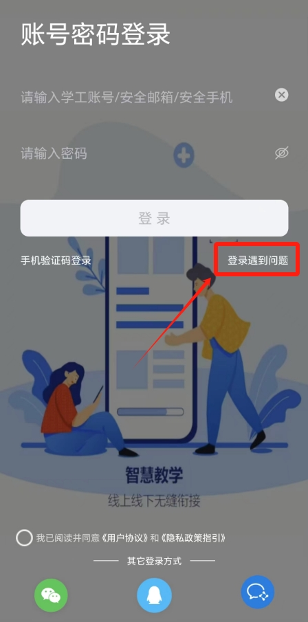 2.首次登录点击“登录遇到问题”,选择“账号激活”,根据提示激活账号并设置密码。
