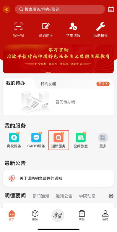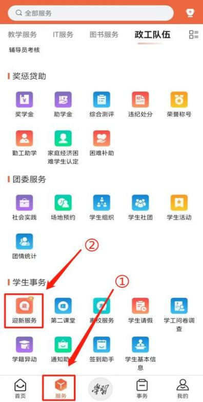 登录“西安明德理工学院”APP后,在“首页”→“我的服务”中选择“迎新服务”或在①“服务”→选择②“迎新服务”。