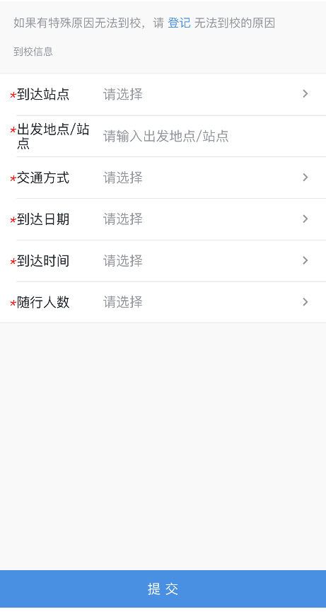 2.因故不能按时到校的新生,可填写无法到校原因,注明预计到校时间或联系所在区域招生老师;