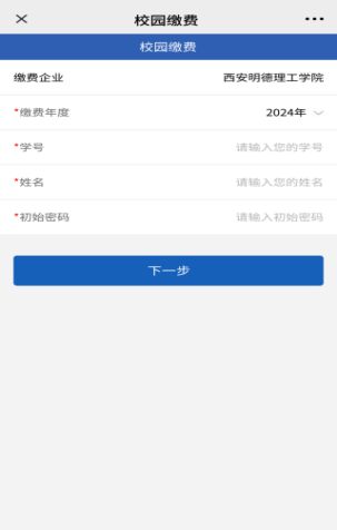 2.选择缴费年度、输入学号、姓名及初始密码(初始密码为身份证号后6位,身份证号如果有字母请输入“大写字母”);