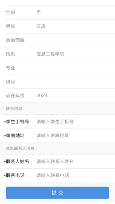 2.填写本人手机号、家庭地址、紧急联系人姓名和联系人电话;