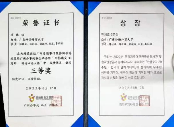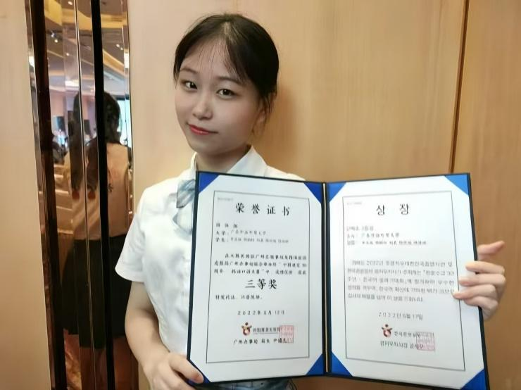 曾获优秀二等奖学金、优秀三等奖学金,优秀学生骨干、校优秀教学信息员荣誉称号,“中韩建交30周年-韩语口语大赛”团体组三等奖