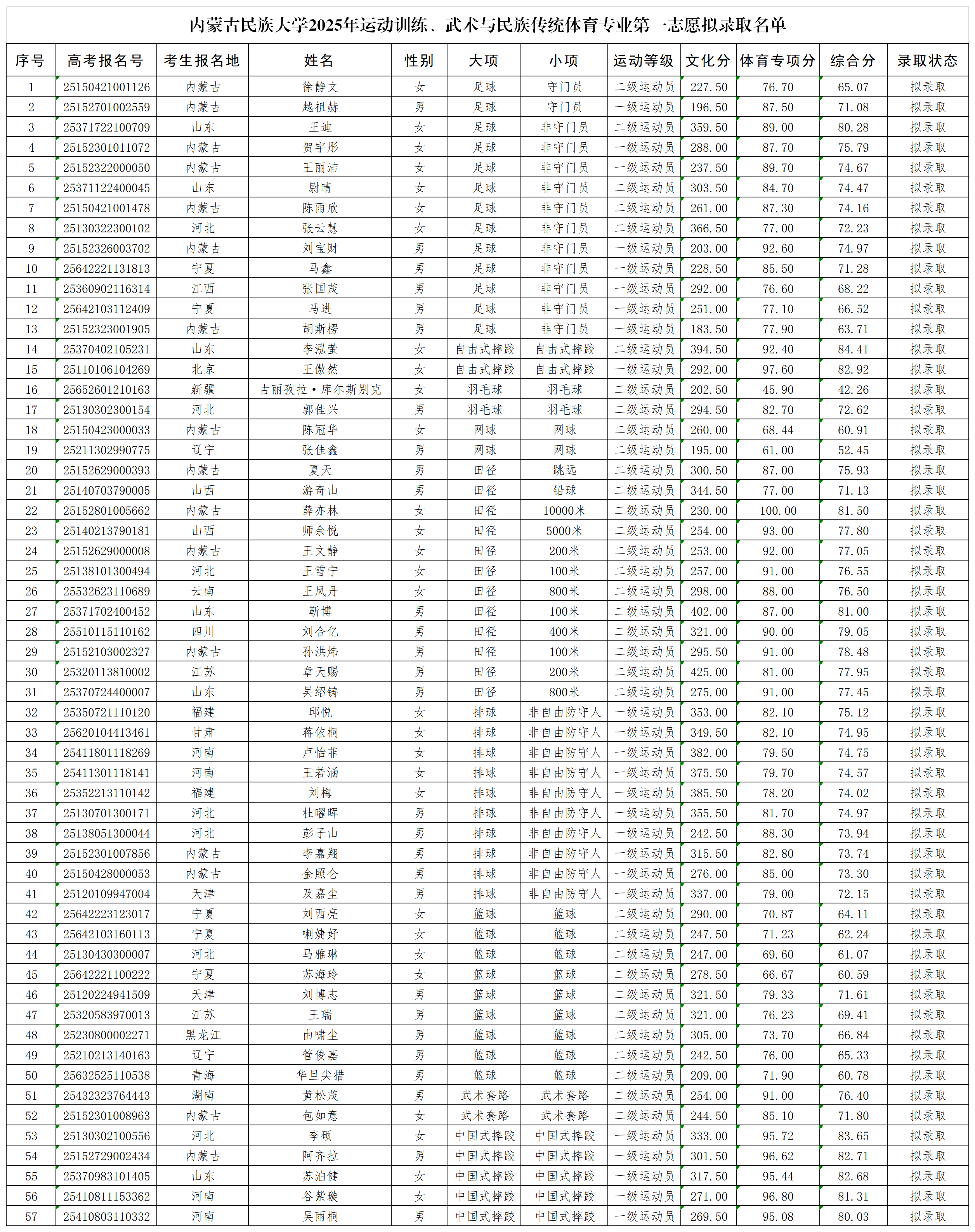 根据《体育总局办公厅教育部办公厅关于印发<2025年普通高等学校运动训练、武术与民族传统体育专业招生管理办法>的通知》(体科字〔2024〕256号)和《内蒙古民族大学2025年运动训练、武术与民族传统体育专业招生简章》,现将第一志愿拟录取名单予以公示,公示期:2025年5月22日-29日,电话:0475-8313584。