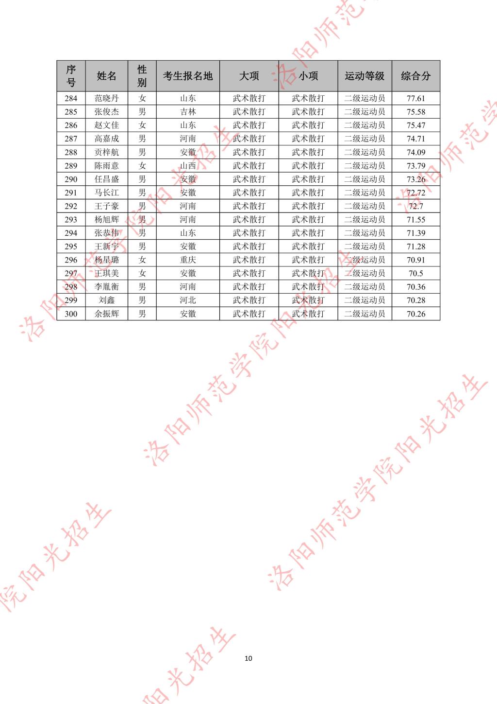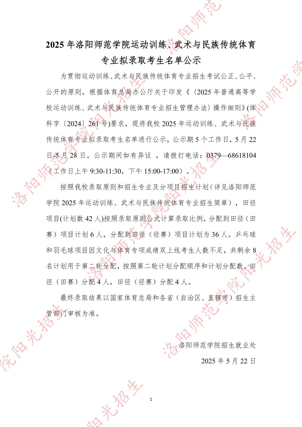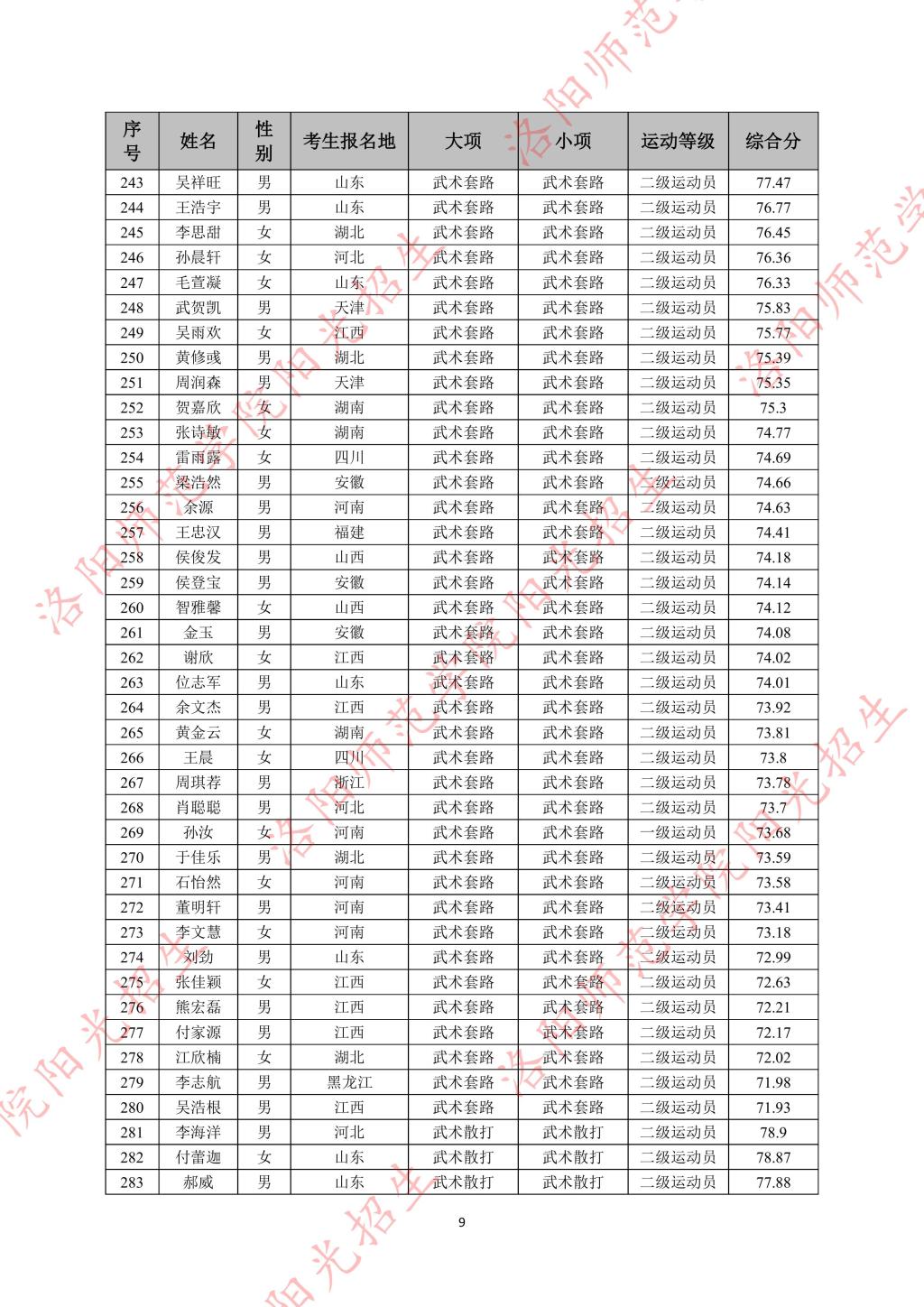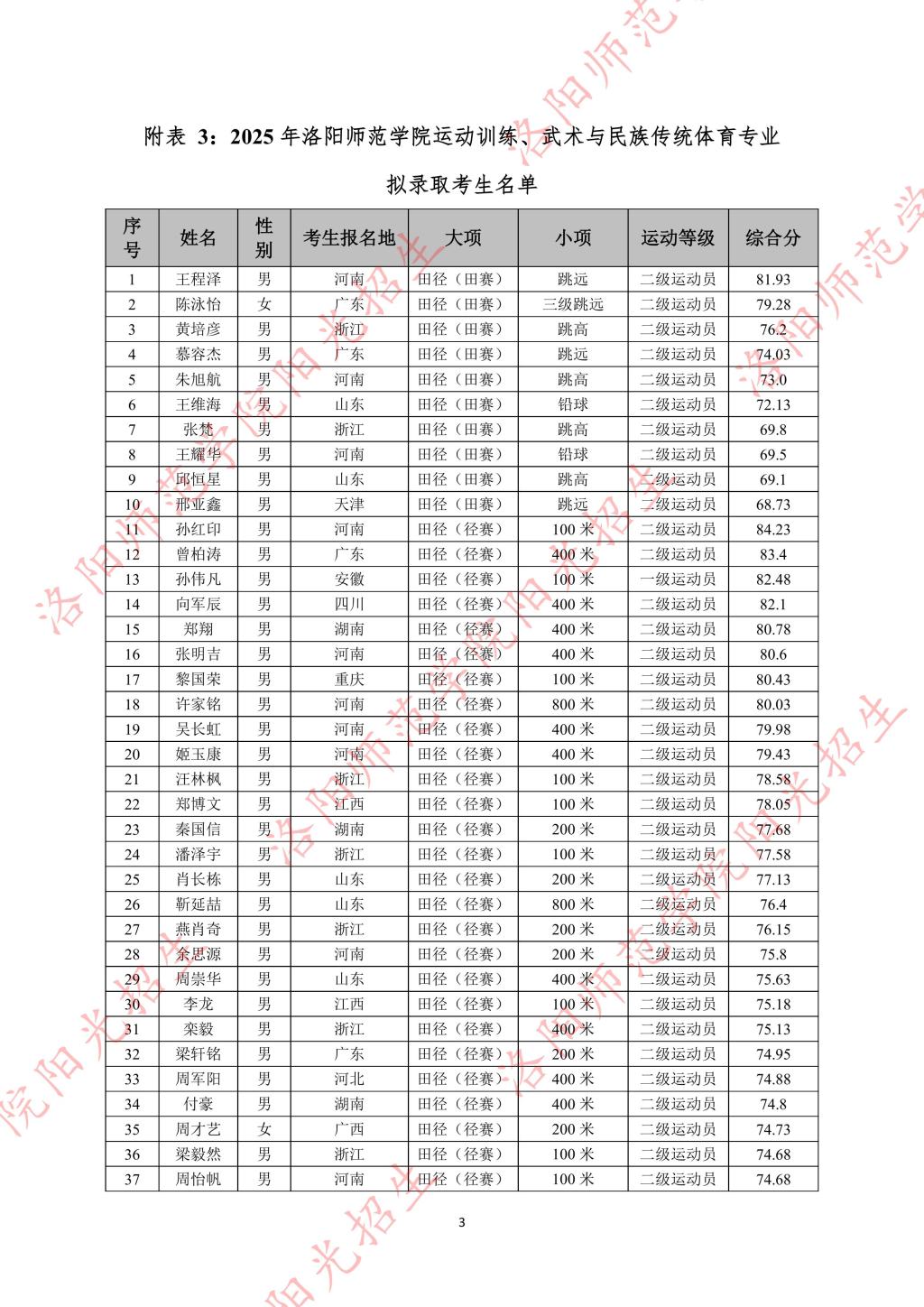 2025年洛阳师范学院运动训练、武术与民族传统体育专业拟录取考生名单公示