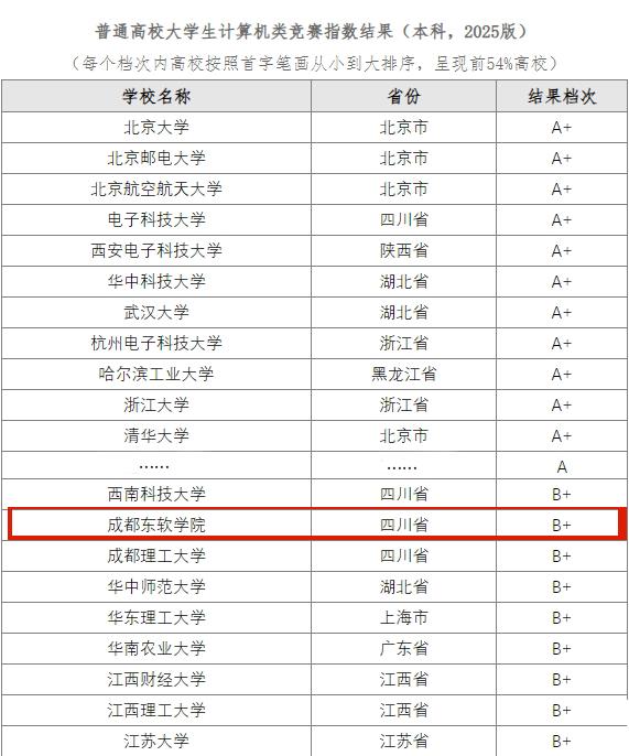 5月19日,全国高等学校计算机教育研究会、教师教学发展研究国家级虚拟教研室和浙大城市学院高等教育数智评价研究中心联合发布普通高校大学生计算机竞赛指数(本科,2025版,以下简称“2025版计算机竞赛指数”)。报告显示,我校稳居四川省民办高校首位,占全国高校分数段前12%,同时,在指数覆盖的全国1176所本科院校(不含职业大学)高校中跻身民办高校前三,与北京师范大学、北京工业大学、广州大学、南开大学等知名高校共同位列B+段。