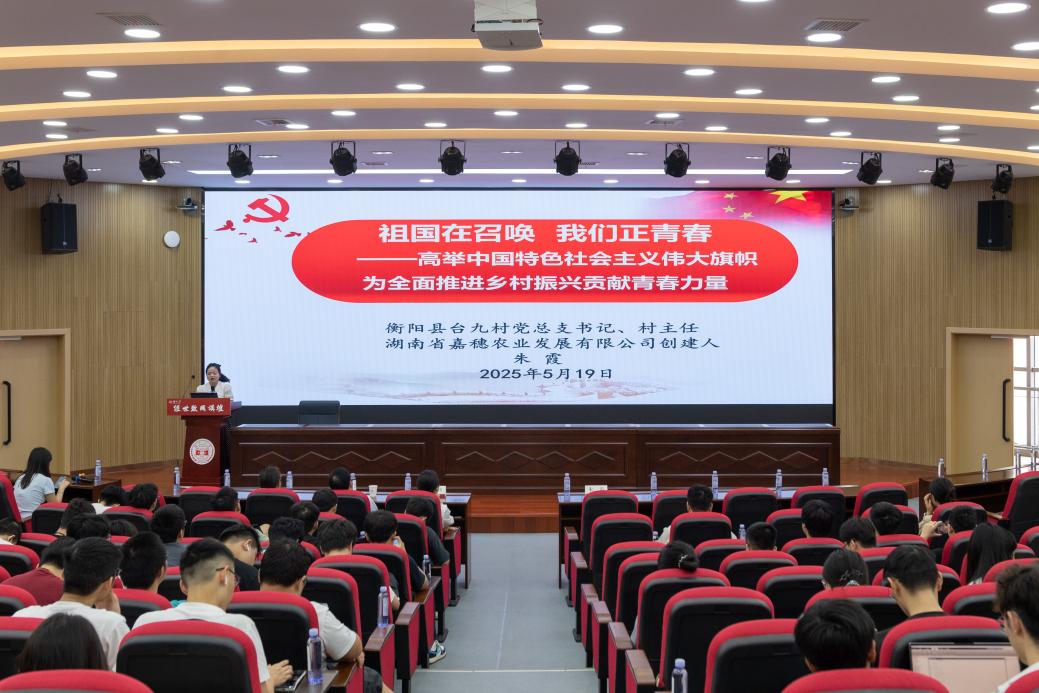朱霞简要介绍了自己放弃城市工作返乡创业的故事。作为村党总支书记,她在利用绿色种植技术实现助农增收的同时,还创办村刊、开设留守儿童课堂、推动村容整治与文化设施建设。朱霞鼓励青年学子积极投身乡村振兴,在农业现代化进程中贡献青春智慧。