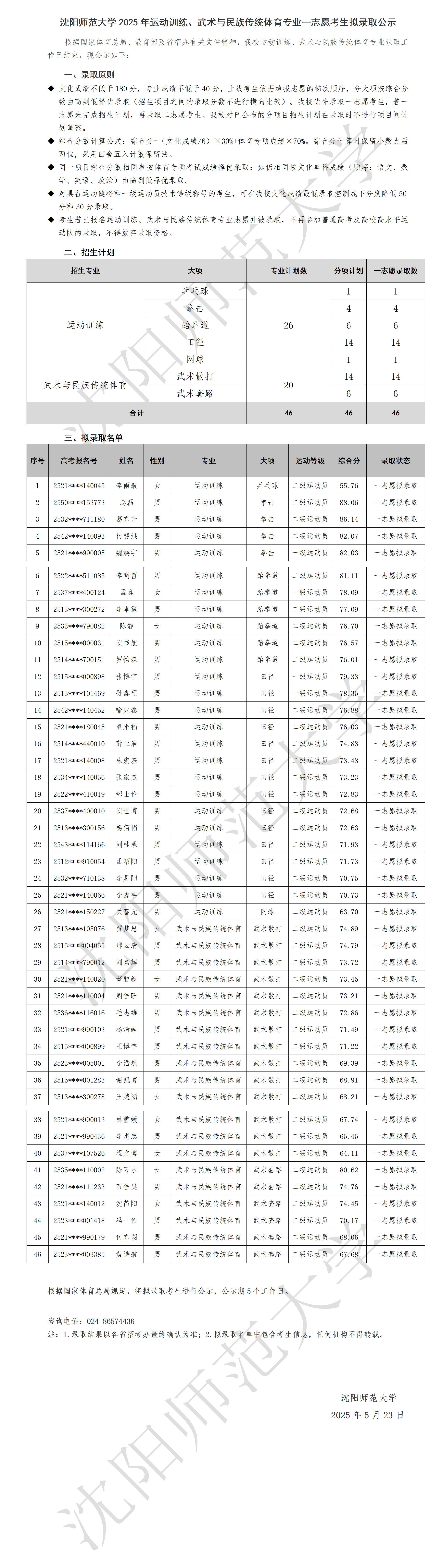 沈阳师范大学2025年运动训练、武术与民族传统体育专业一志愿考生拟录取公示