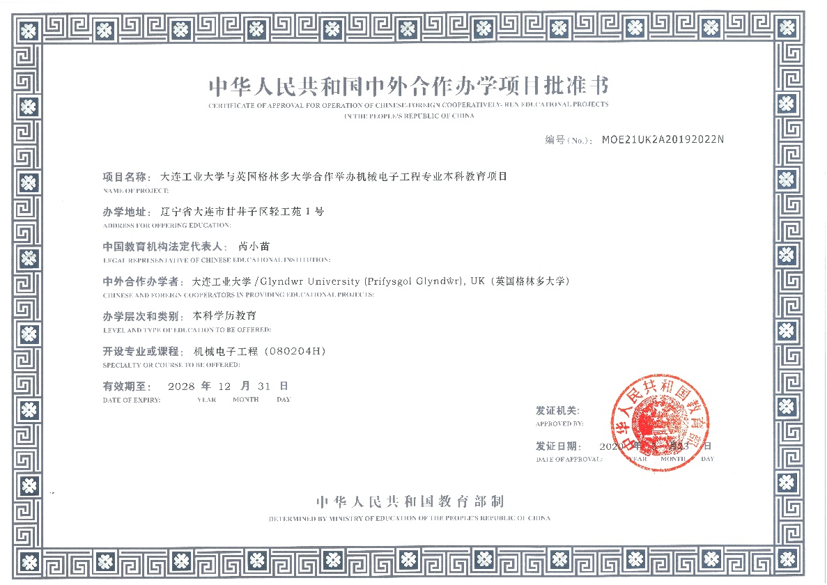 2020年2月,经中华人民共和国教育部批准,大连工业大学与英国雷克瑟姆大学(WrexhamUniversity)合作举办机械电子工程专业本科教育项目(项目批准书编号:MOE21UK2A20192022N)。