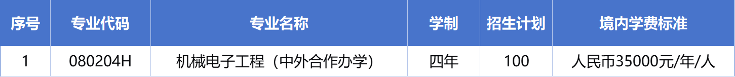 大连工业大学与英国雷克瑟姆大学合作举办机械电子工程专业本科教育项目自2020年开始招生,纳入我校年度普通高等学校招生计划,按全国普通本科批次录取,招生专业设置如下: