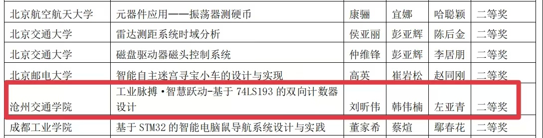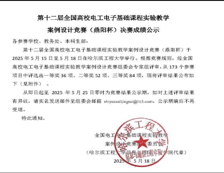 5月15日至18日,全国总决赛在哈尔滨工程大学举行。经过与全国各赛区优秀教师的激烈角逐,电气教研室刘昕伟老师的实验案例《工业脉搏·智慧跃动——基于74LS193的双向计数器设计》荣获全国二等奖,自动化教研室左亚青老师的《RC一阶电路解密电磁炮》实验案例获得全国三等奖。两项获奖作品充分展现了我校在电工电子实验教学领域的创新能力和实践水平。
