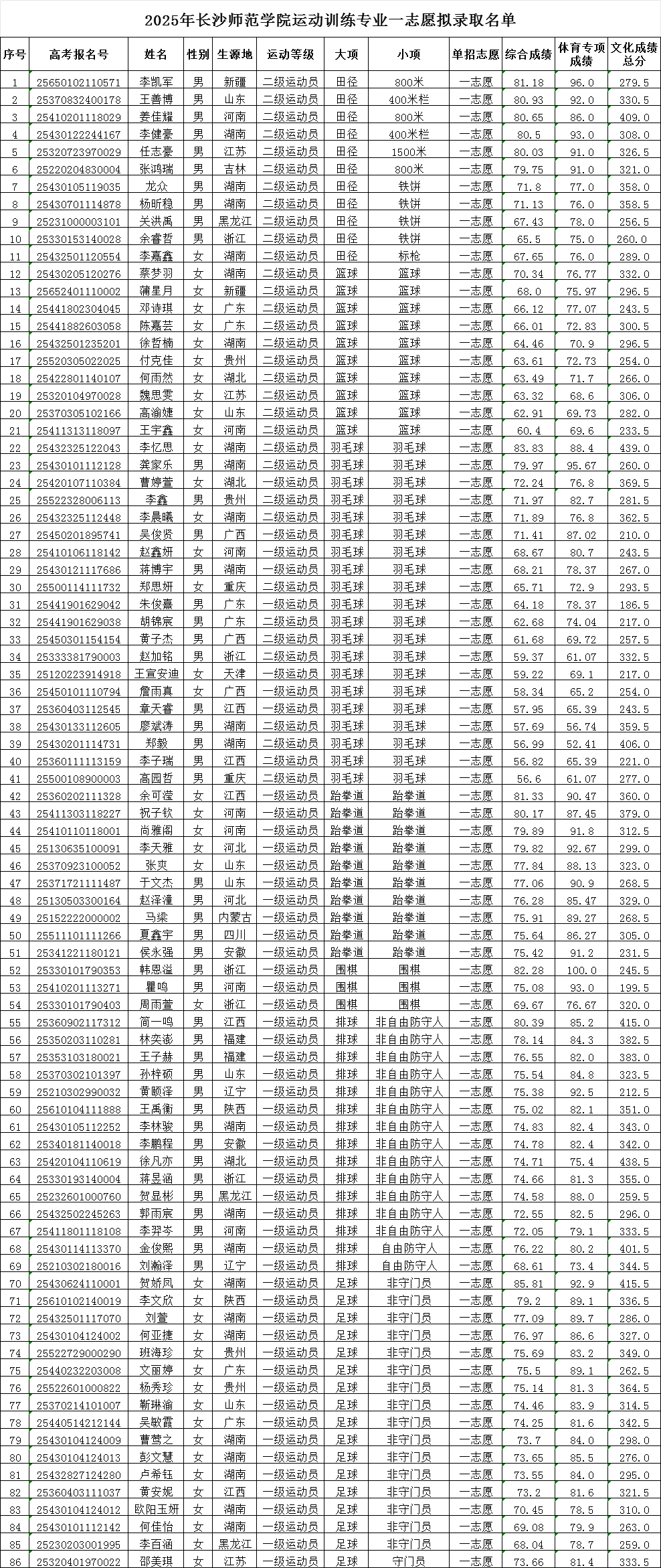 根据《2025年普通高等学校运动训练、武术与民族传统体育专业招生管理办法》(体科字﹝2024﹞256号)和《长沙师范学院2025年运动训练专业招生简章》等文件规定,现将2025年运动训练专业一志愿拟录取名单(见附表)进行公示,公示时间:2025年5月23日-5月29日,如对公示名单有异议,请在公示期内实名反映问题,逾期不予受理。正式录取名单以教育部、国家体育总局及各省招生考试机构审核通过为准。