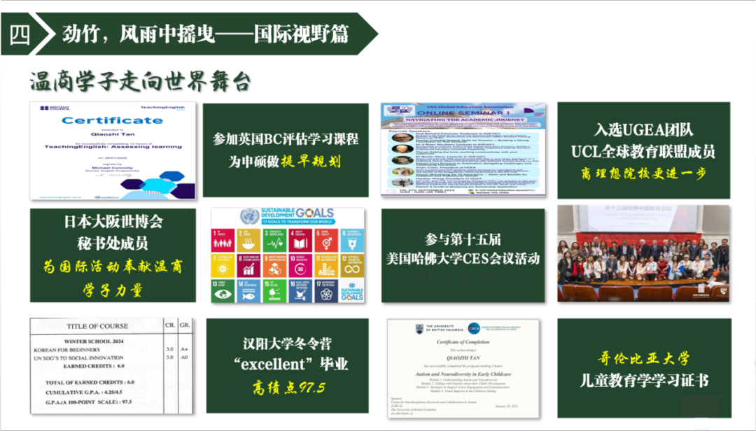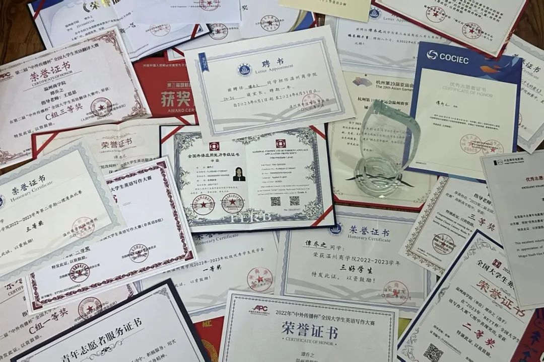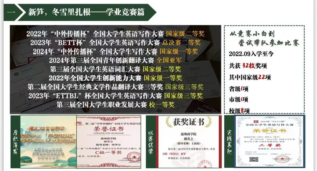 我校22商务英语专业(3+1+1国际菁英班)学生,谭乔之,高中毕业于温州市第五十一中学。她高考发挥没有达到预期,英语仅64分,却只用一年时间,雅思首考逆袭6.0。从零经验小白到带队参加各类比赛,大学期间共获奖32项,其中国家级奖项22项。靠着她独有的“竹蕴哲学”,勇夺浙江省政府奖学金、校特等奖学金、校三好学生等满车荣誉,同时被哈德斯菲尔德大学本科录取。让我们一起走进她的竹韵人生,品鉴其中的坚韧与智慧。