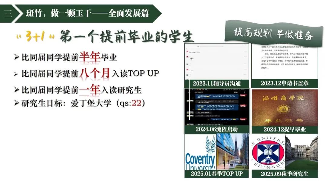 凭借着自己的努力,她比同届学生提前半年毕业,并在今年被评选为浙江省优秀毕业生,这代表她将比同届学生提前1年入读研究生,成为同届3+1+1菁英计划中第一个提前毕业的学生!