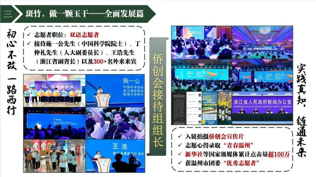 同时,她谨记我校“善行天下,爱满校园”的育人特色,利用寒暑假和课余时间,积极参加了20余项大型志愿活动。在杭州亚运会活动中,她以双语志愿者的身份向外国友人介绍中国文化,展现国际学院学子风貌。在侨创会,她以接待组组长身份接待三百多位外来来宾,志愿心得被青春温州公众号录取。更以优秀志愿代表入镜新华社拍摄,浏览量高达100余万。