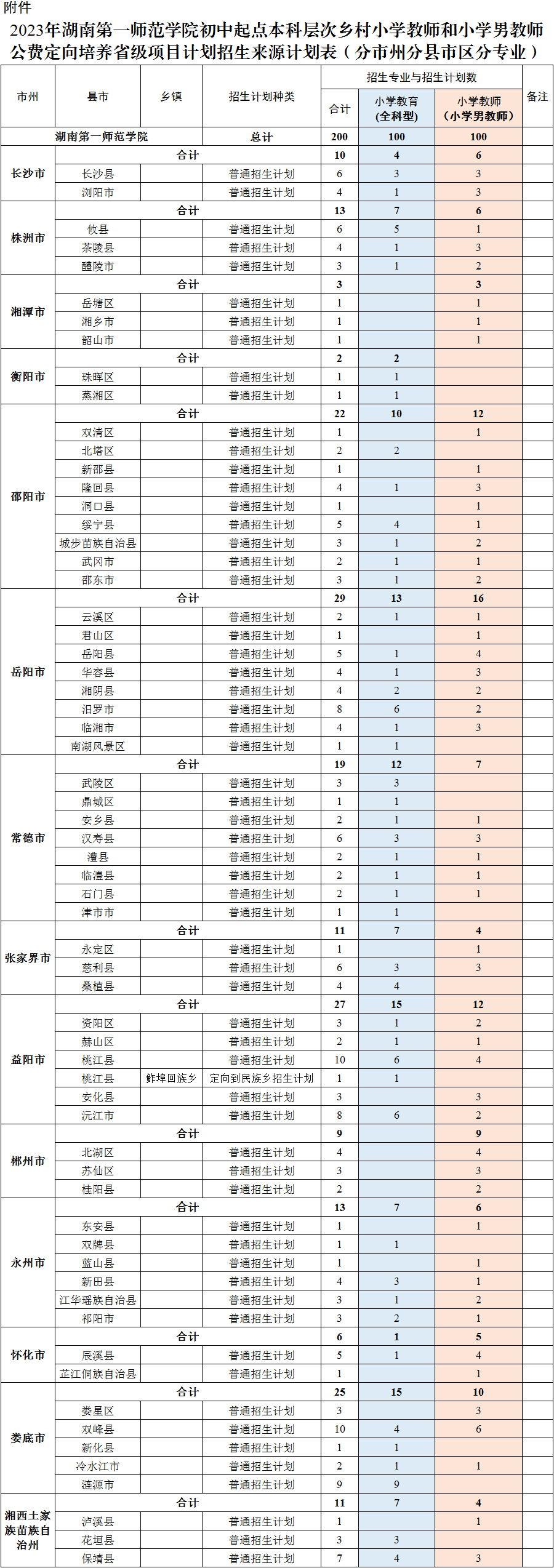 附件:2023年湖南第一师范学院初中起点本科层次乡村小学教师和小学男教师公费定向培养省级项目计划招生来源计划表(分市州分县市区分专业)