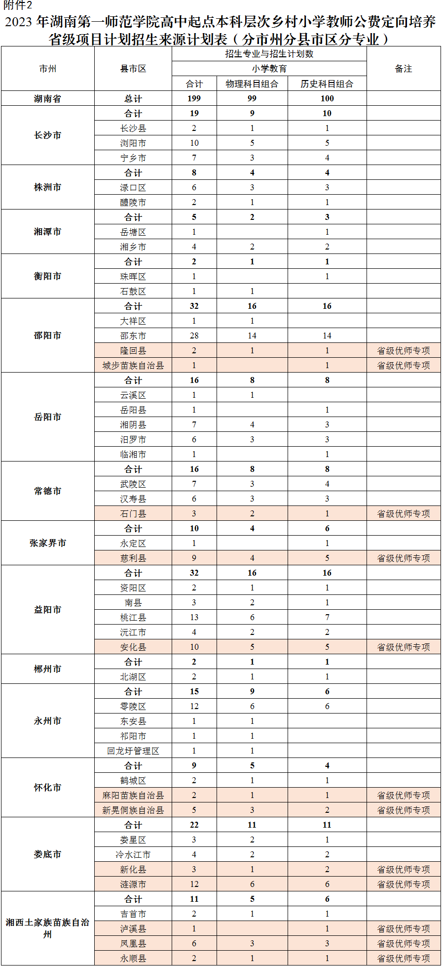 2.2023年湖南第一师范学院高中起点本科层次乡村小学教师公费定向培养省级项目计划招生来源计划表(分市州分县市区分专业)