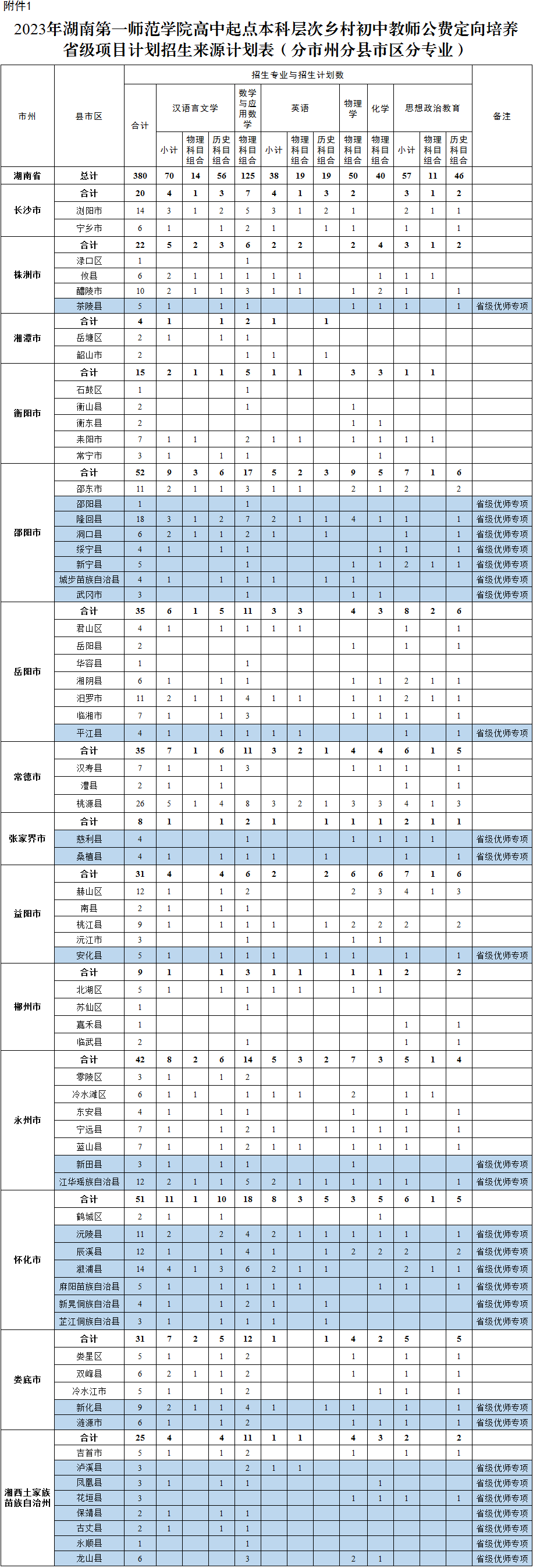 1.2023年湖南第一师范学院高中起点本科层次乡村初中教师公费定向培养省级项目计划招生来源计划表(分市州分县市区分专业)