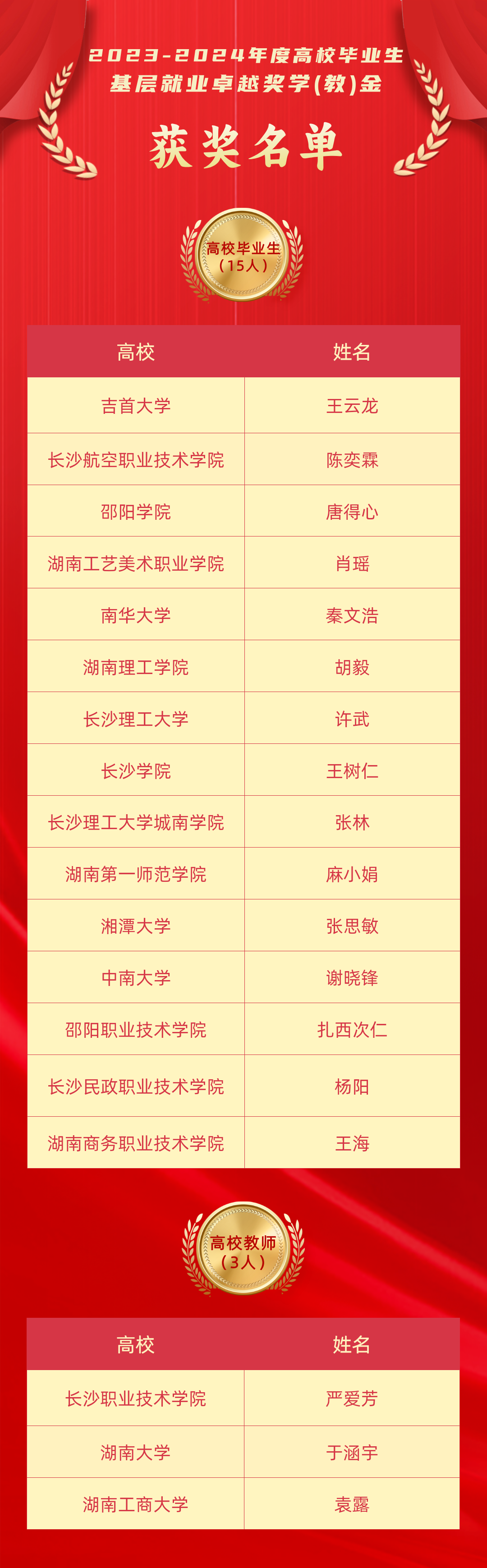 近日,教育部公布2023-2024 年度“高校毕业生基层就业卓越奖学(教)金”获奖人选名单。湖南省15名高校毕业生和3名教师上榜。下面,一起来看——