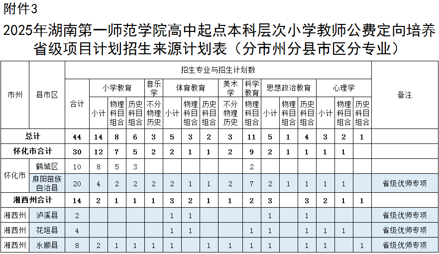 3.2025年湖南第一师范学院高中起点本科层次小学教师公费定向培养省级项目计划招生来源计划表(分市州分县市区分专业)