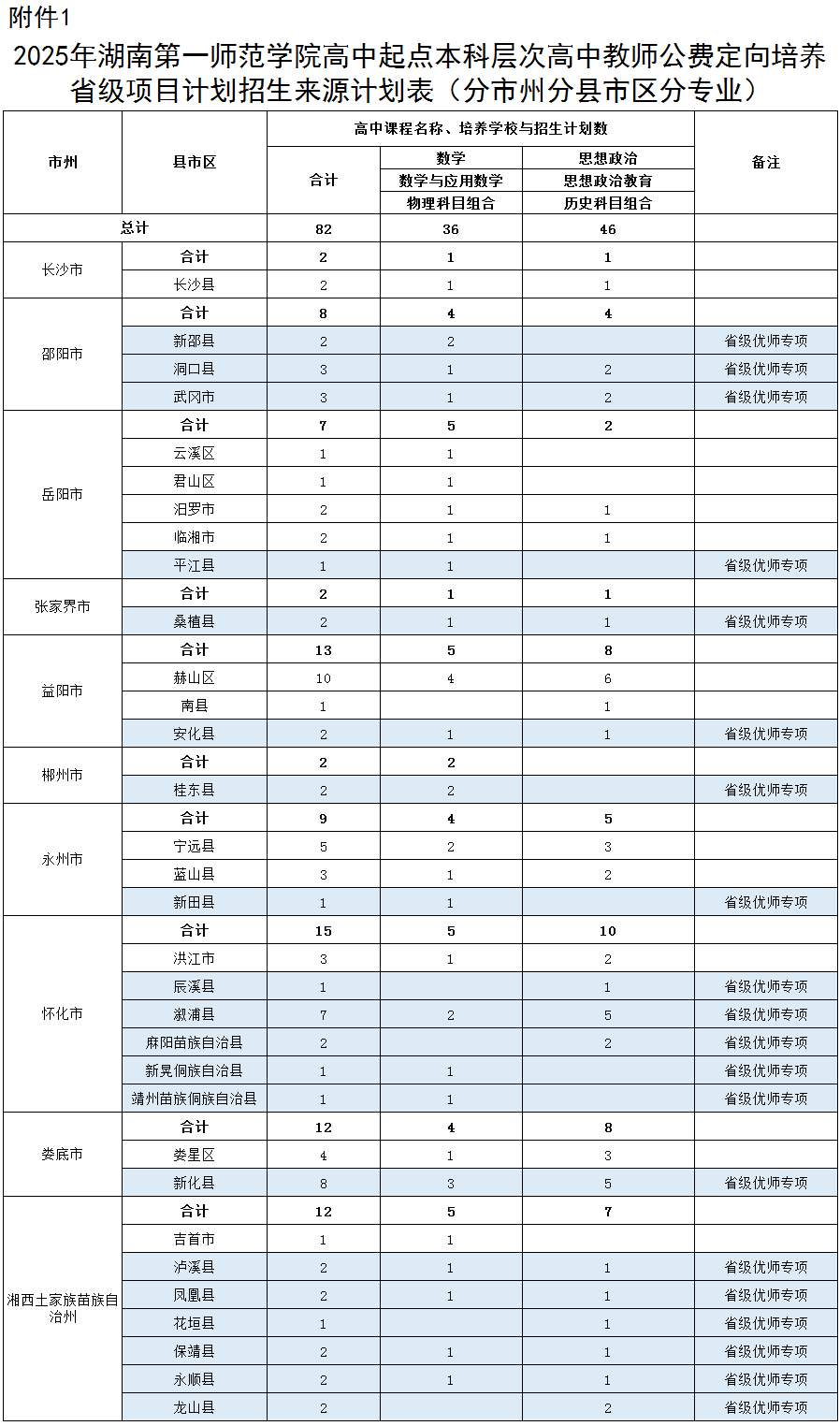 附件:1. 2025年湖南第一师范学院高中起点本科层次高中教师公费定向培养省级项目计划招生来源计划表(分市州分县市区分专业)