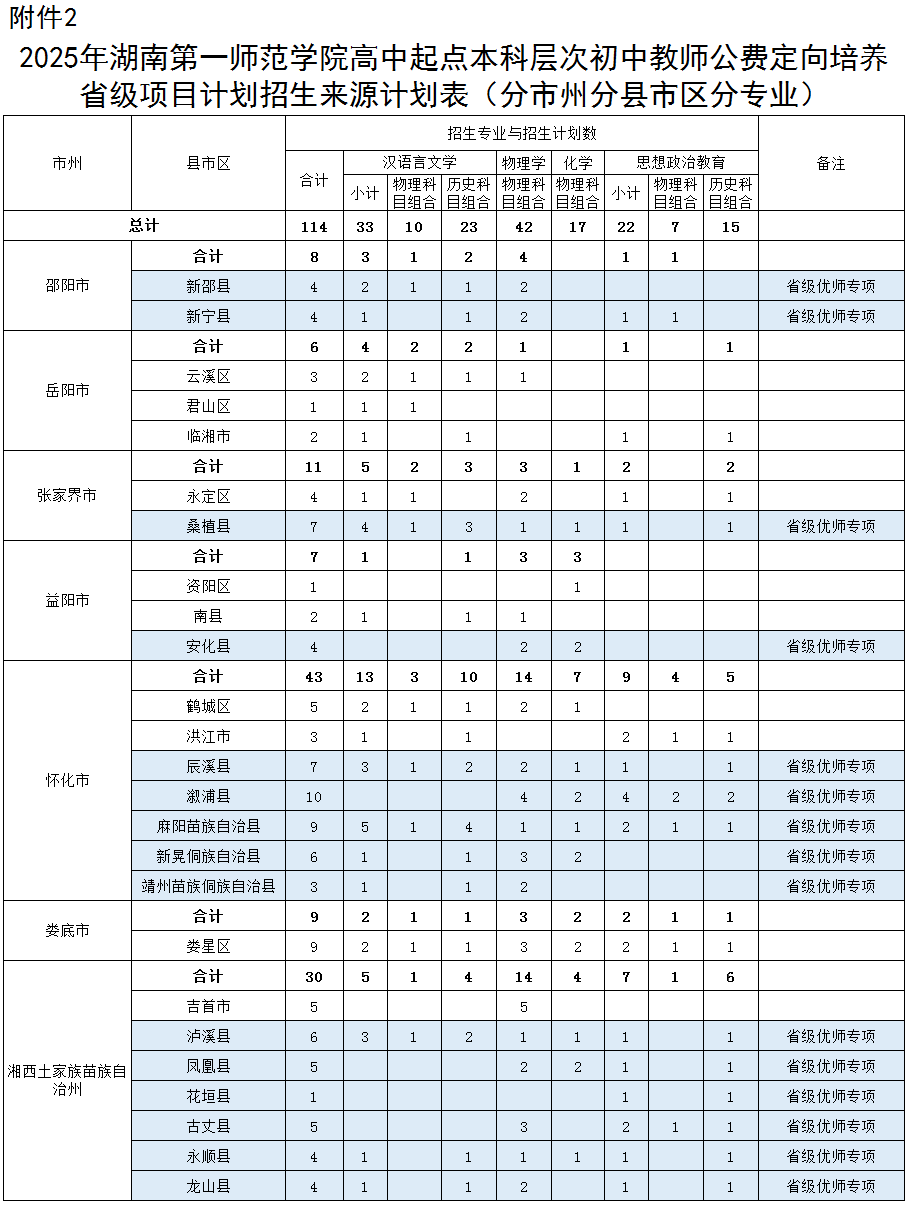 2.2025年湖南第一师范学院高中起点本科层次初中教师公费定向培养省级项目计划招生来源计划表(分市州分县市区分专业)