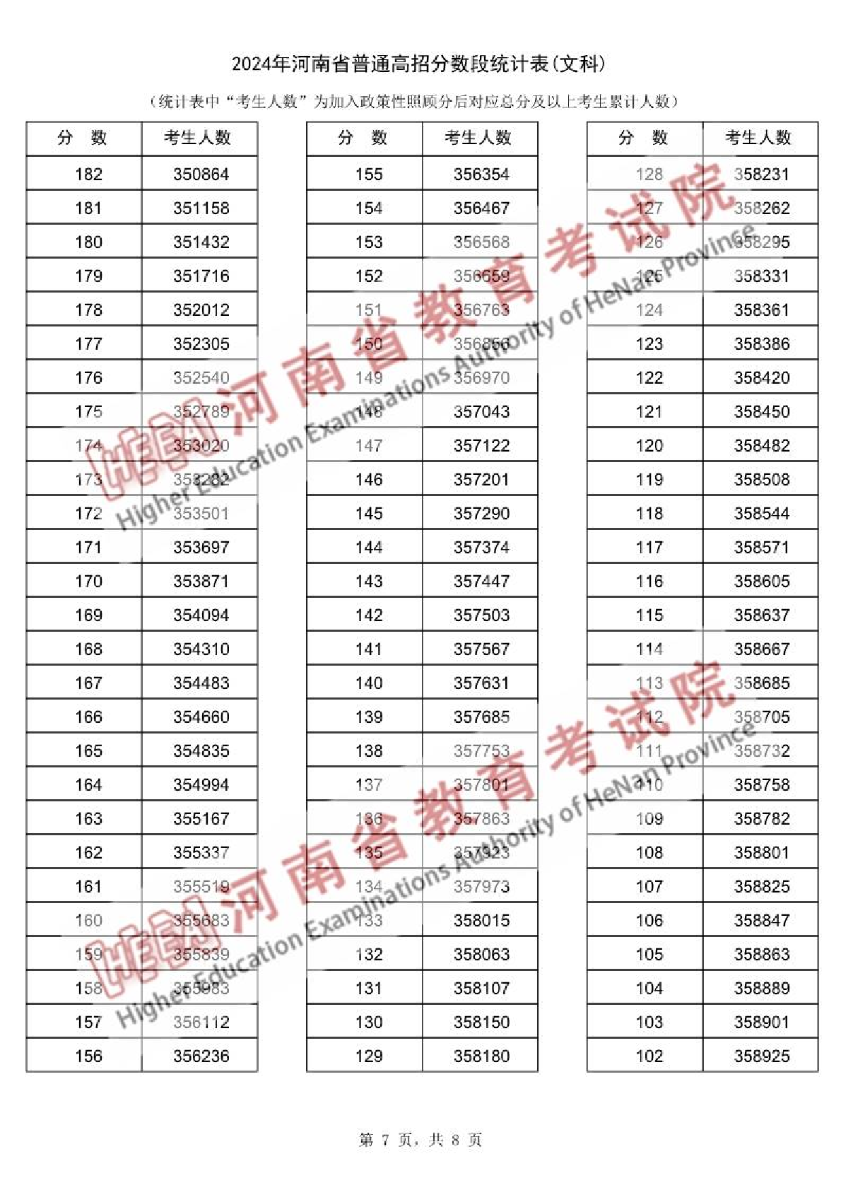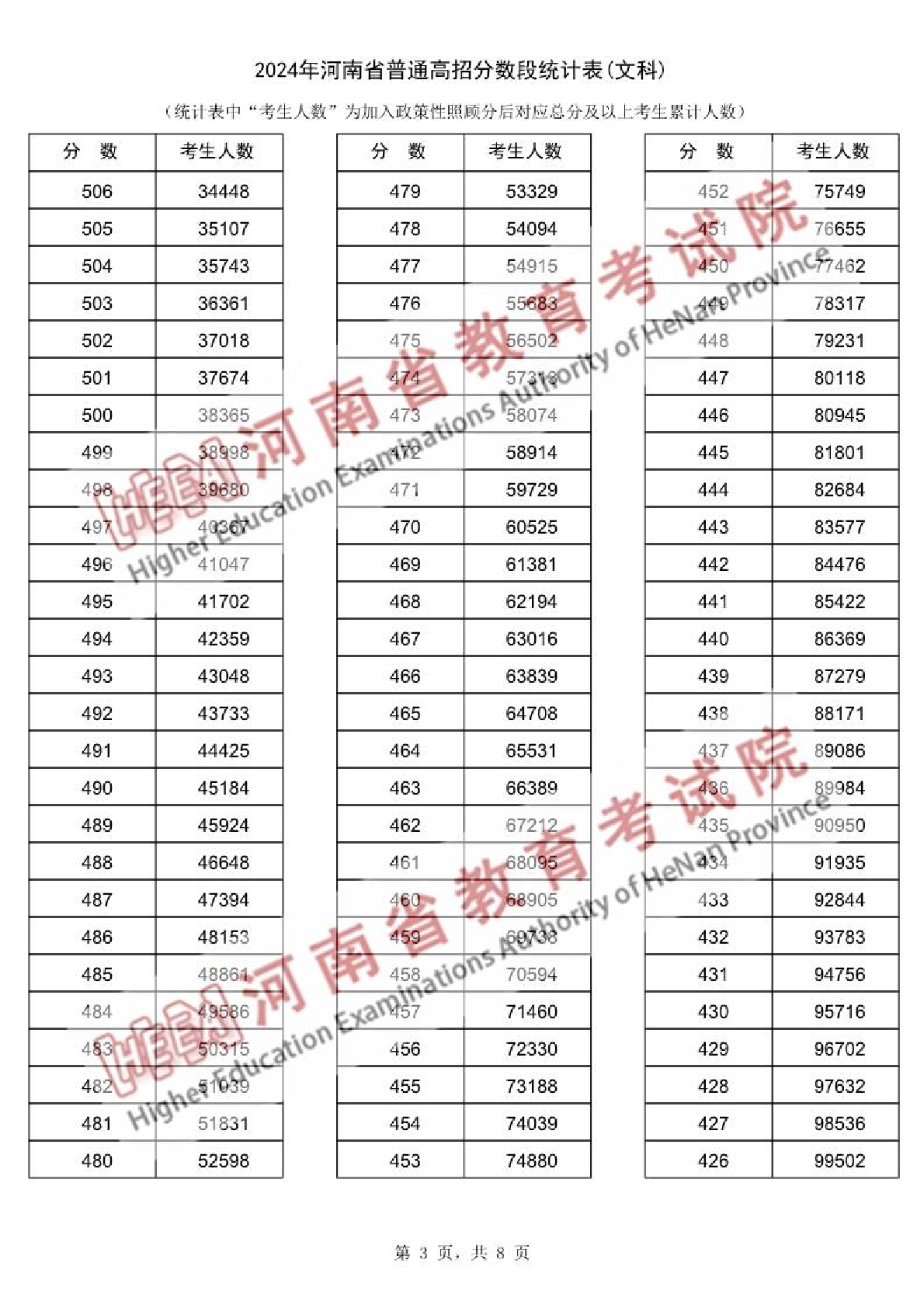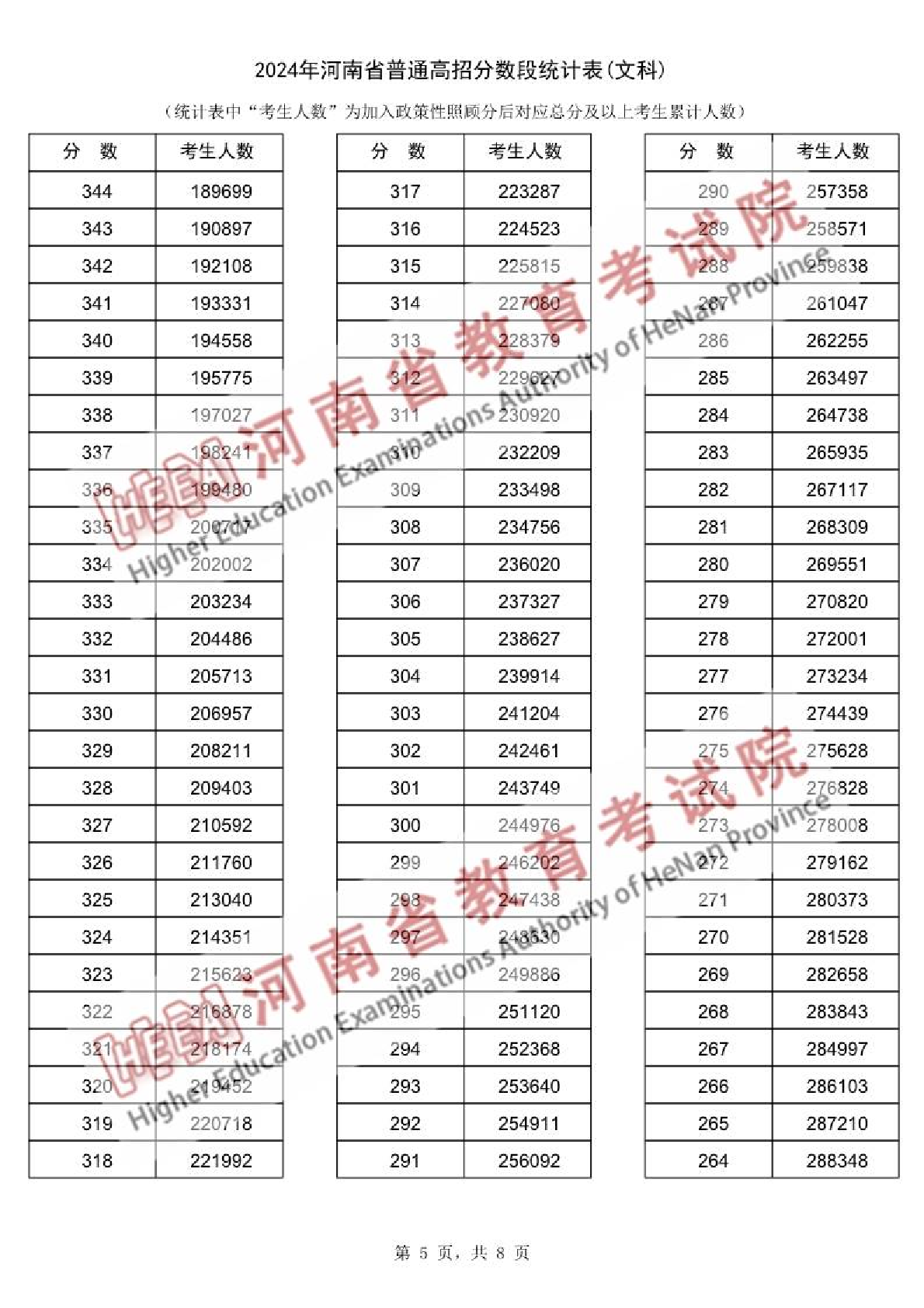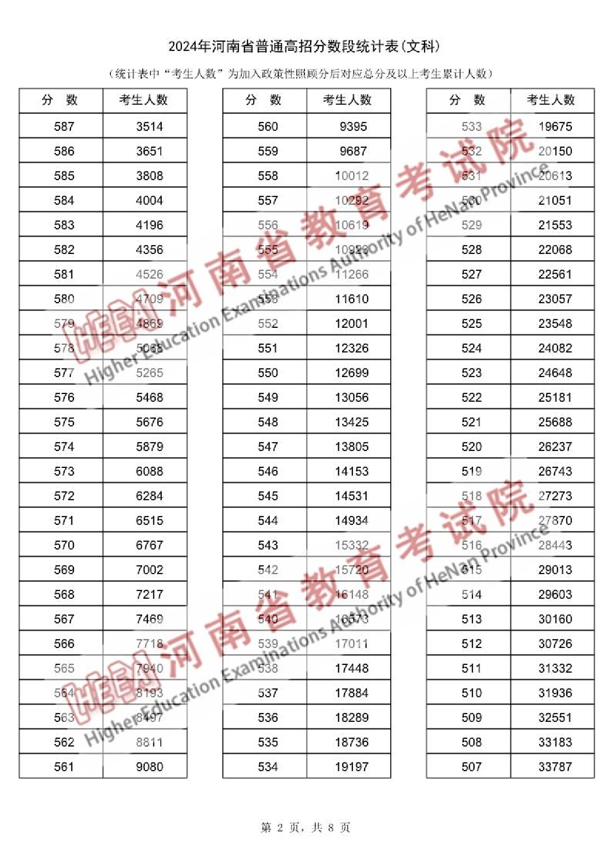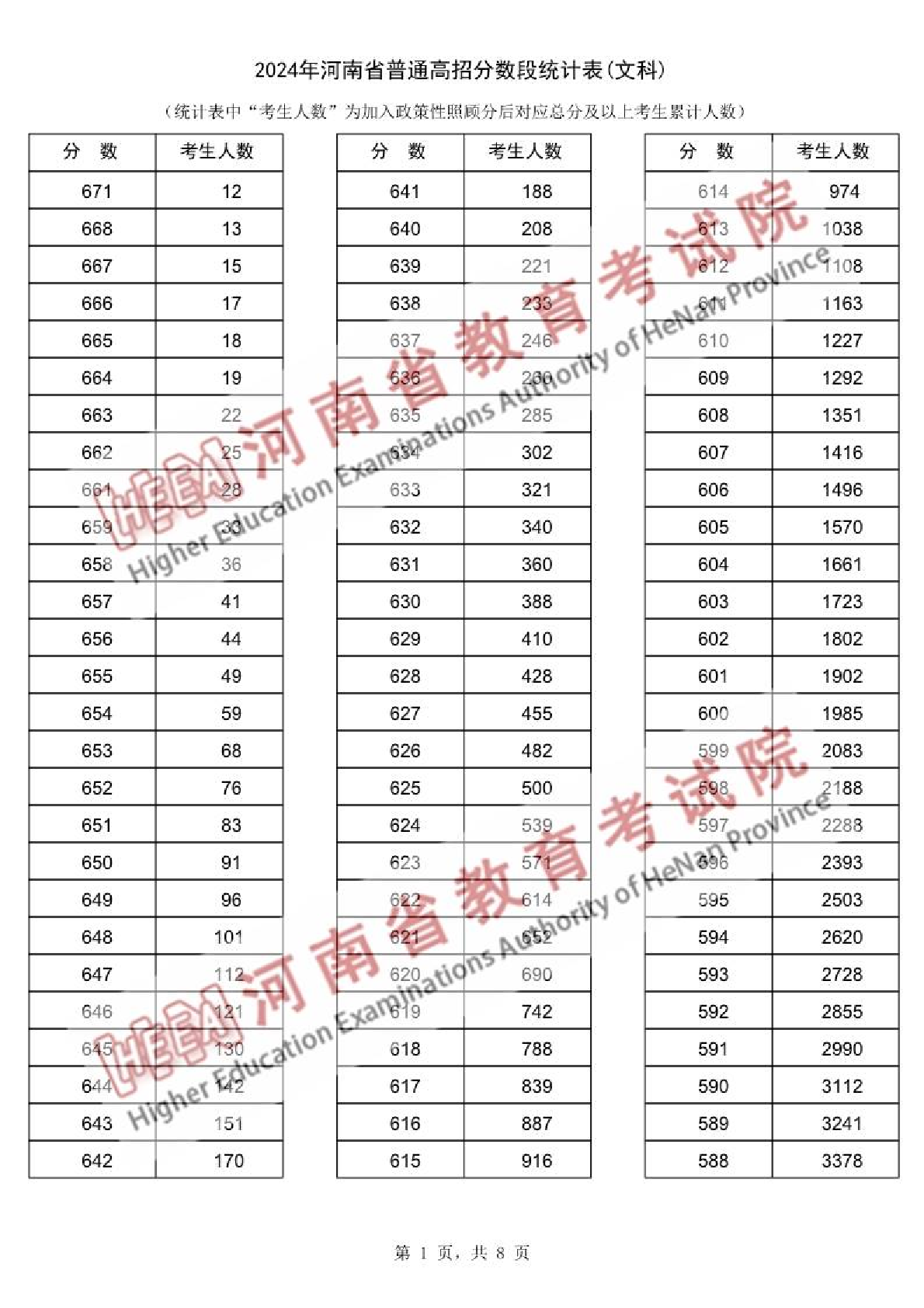 2024年河南省普通高招分数段统计表(文科)