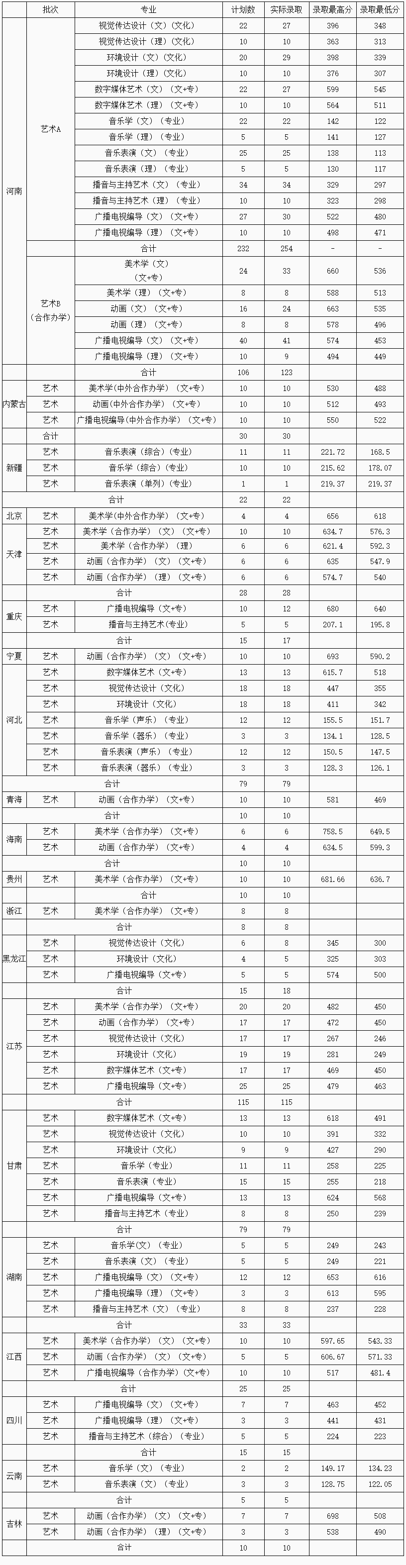黄淮学院2017年艺术本科录取情况统计表
