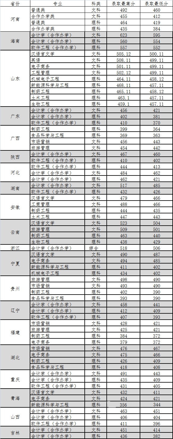黄淮学院2017年本科分省分专业录取情况统计表