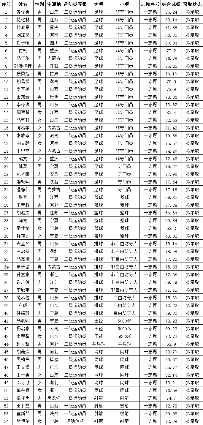 我校拟录取符合条件的一志愿考生54人,现将拟录取名单予以公布(详见附件)。部分未完成计划的项目,将按照国家体育总局、教育部的相关规定录取二志愿考生,录取结果另行公布。
