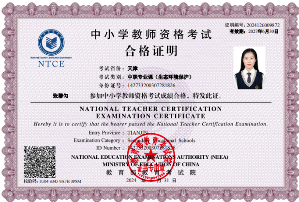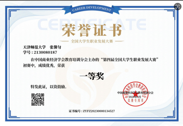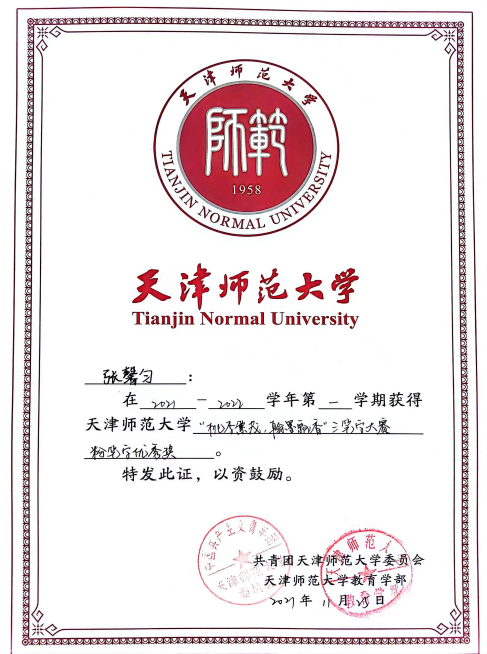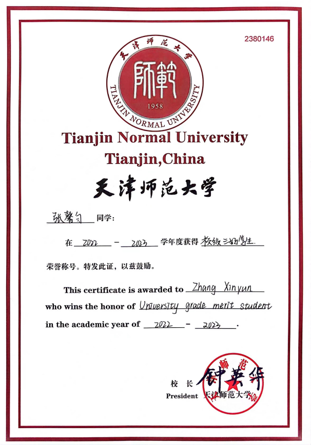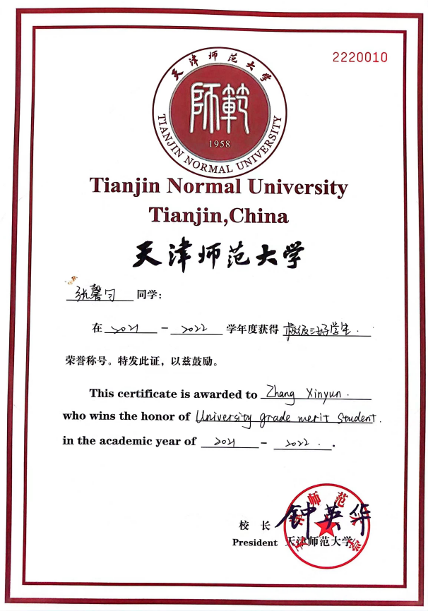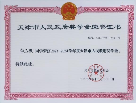 在大学期间,努力学习,坚持全面发展。在学业上,学习成绩优异,获得2024学年天津市人民政府奖学金,已保送至华东师范大学。