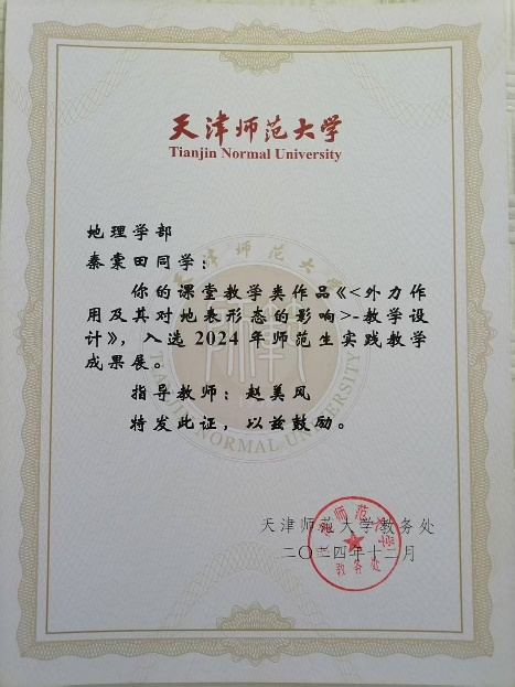 在教育实习中,深耕教材,运用多种教学方法,听取指导教师的意见与建议,认真反思并多次修改教案,在实际的课堂中取得良好的教学效果,其中《<外力作用及其对地表形态的影响>-教学设计》入选2024年师范生实践教学成果展。一点一滴的知识积累与教学实践磨练,为未来教师职业发展夯实了基础。希望未来在基础教育沃土中向下扎根,向上生长。