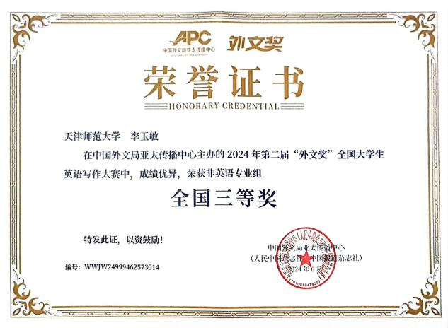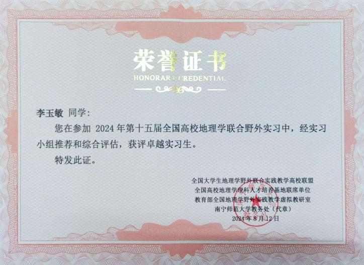 在竞赛上,积极参加各项学科竞赛,共获得5项国家级奖项和1项市级奖项,其中包括第二届“行远杯”全国地理野外实践技能越野赛一等奖、第二届“外文奖”全国大学生英语写作大赛三等奖、第二届全国地理研学方案设计大赛&地理研学社会调研大赛设计组特等奖等。