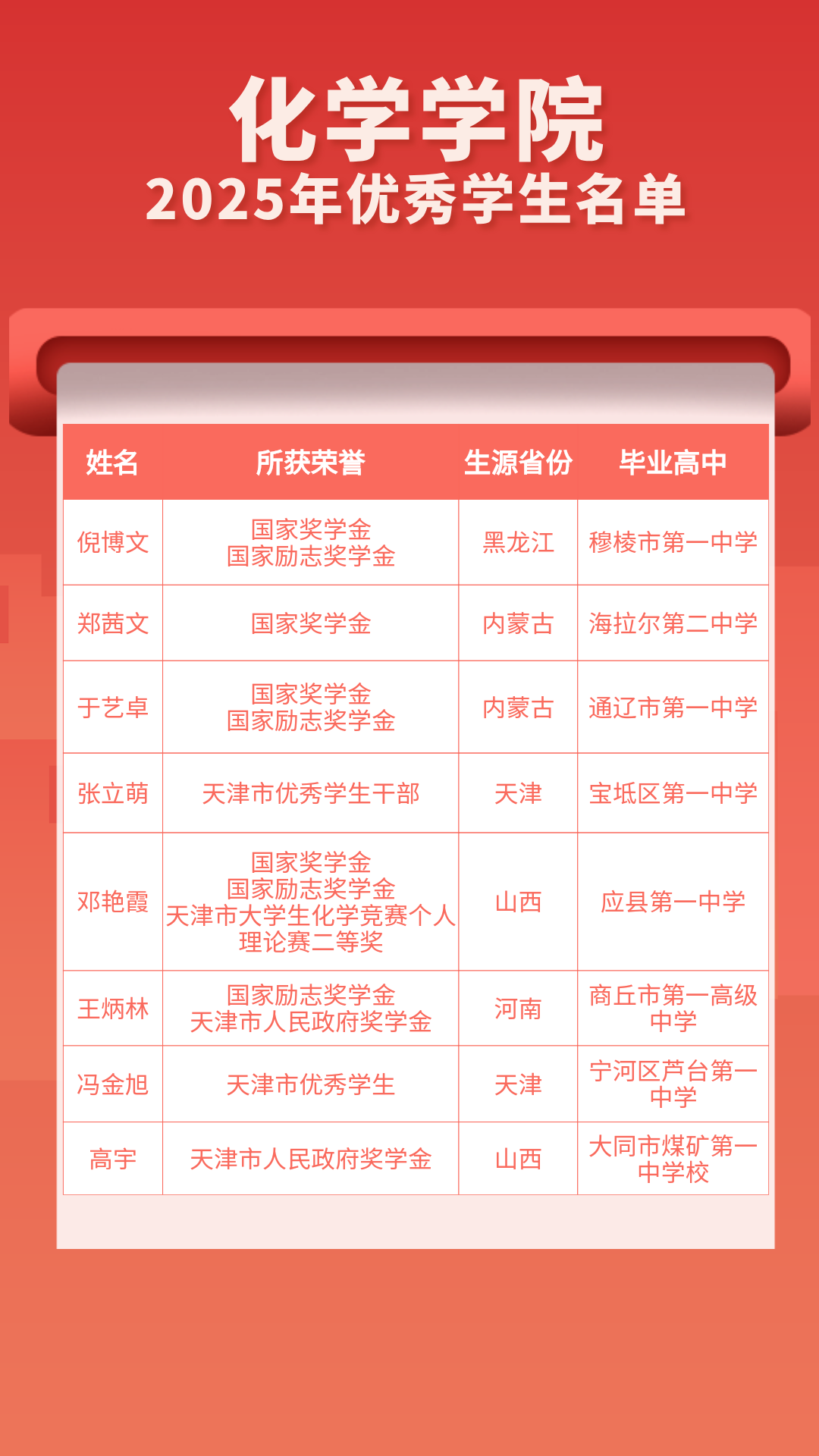 郑茜文,天津师范大学化学学院化学(师范)专业2021级本科生,中共党员。荣获2023-2024年度国家奖学金,获得第七届天津市大学生化学竞赛个人赛一等奖。连续四年获得校级奖学金,多次获评校级三好学生,获得首届大学生职业生涯规划大赛校赛一等奖。现已推免至天津大学。