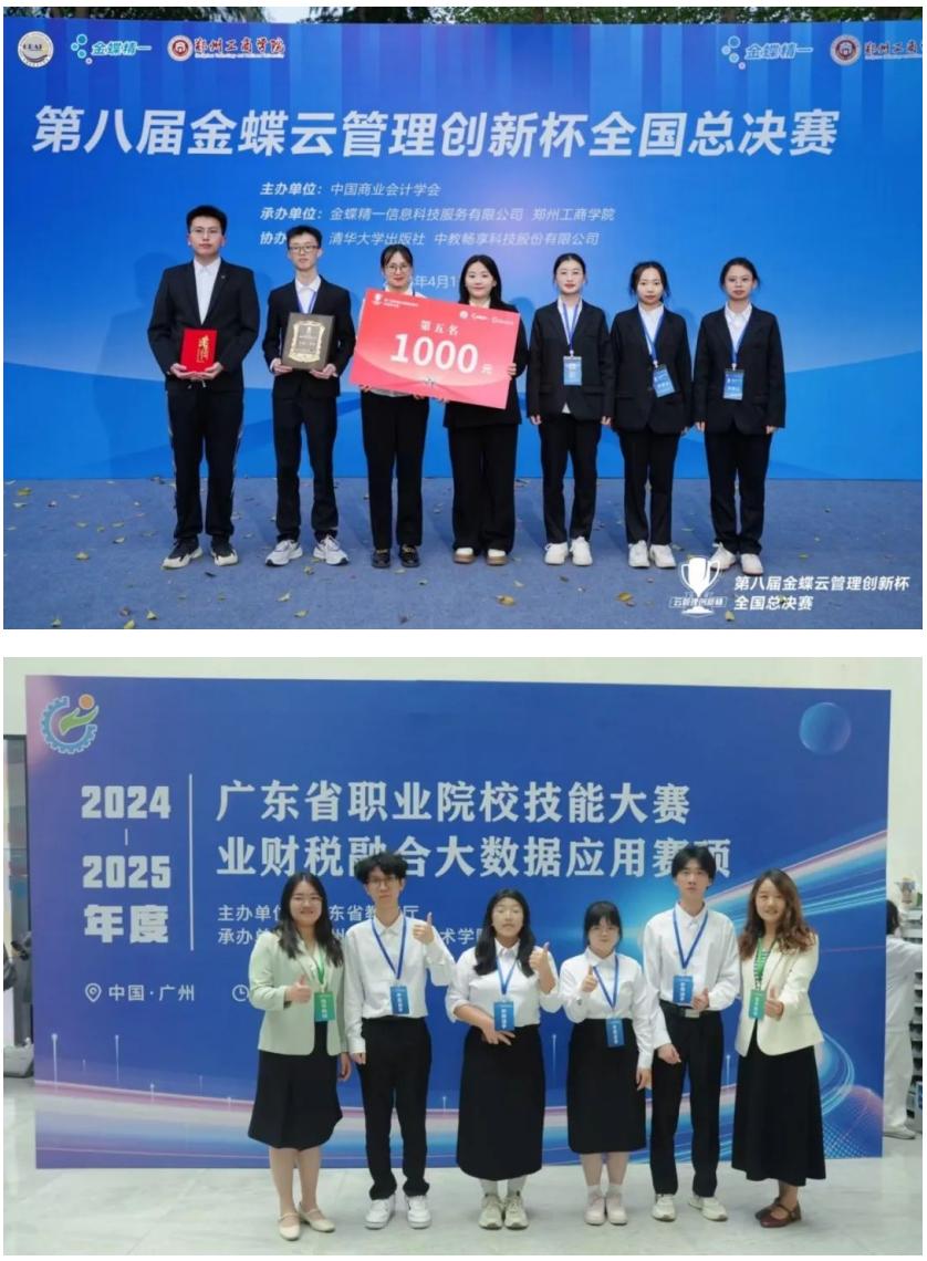 初级会计师考试通过率超20%,财会专业升本率达30%,就业率及对口就业率分别达 98%和85%,企业满意度超98%。近五年学生斩获国家级技能竞赛奖项5项、省级40 项,2024年勇夺金蝶云管理创新杯全国总决赛一等奖,并获 1+X 证书“示范性考核站点”等荣誉,培养出的学生被企业称为“上岗即用型人才”。