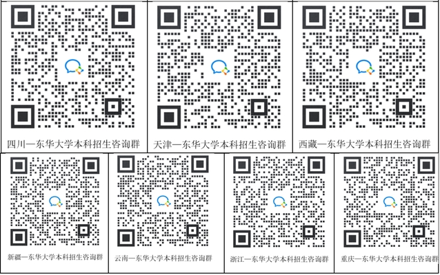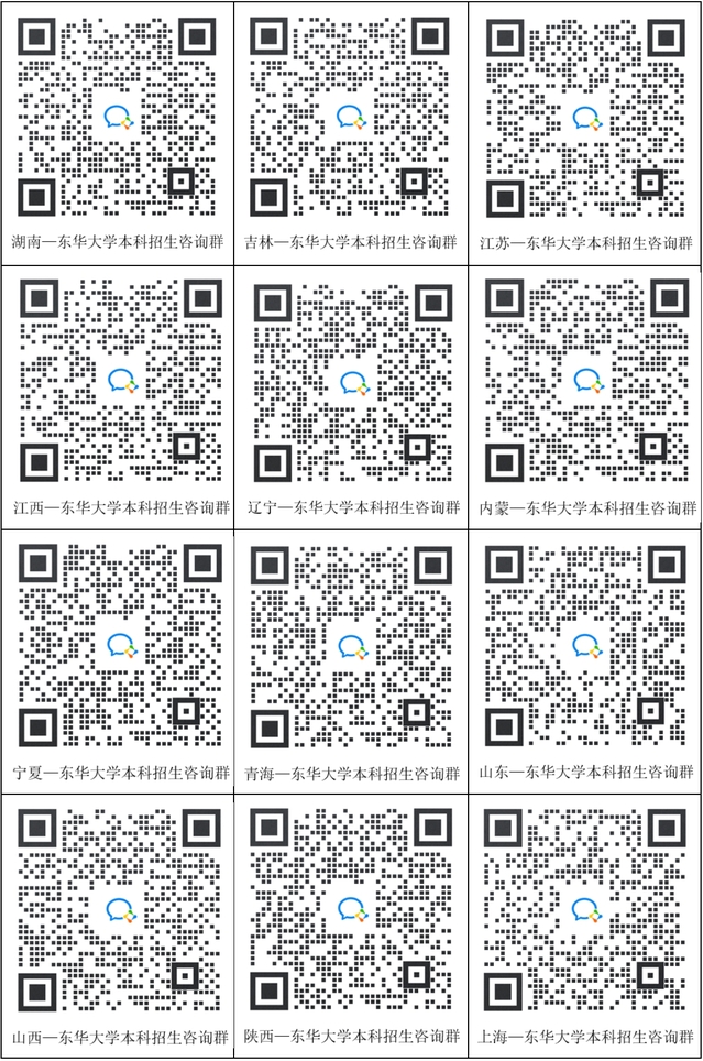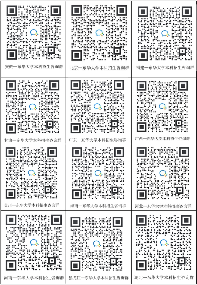 为更好地服务全国考生及家长,东华大学本科招生办公室建立各省份(直辖市、自治区)招生咨询群,由学校老师线上为你解答高考招生相关问题。欢迎广大考生和家长扫码进群!