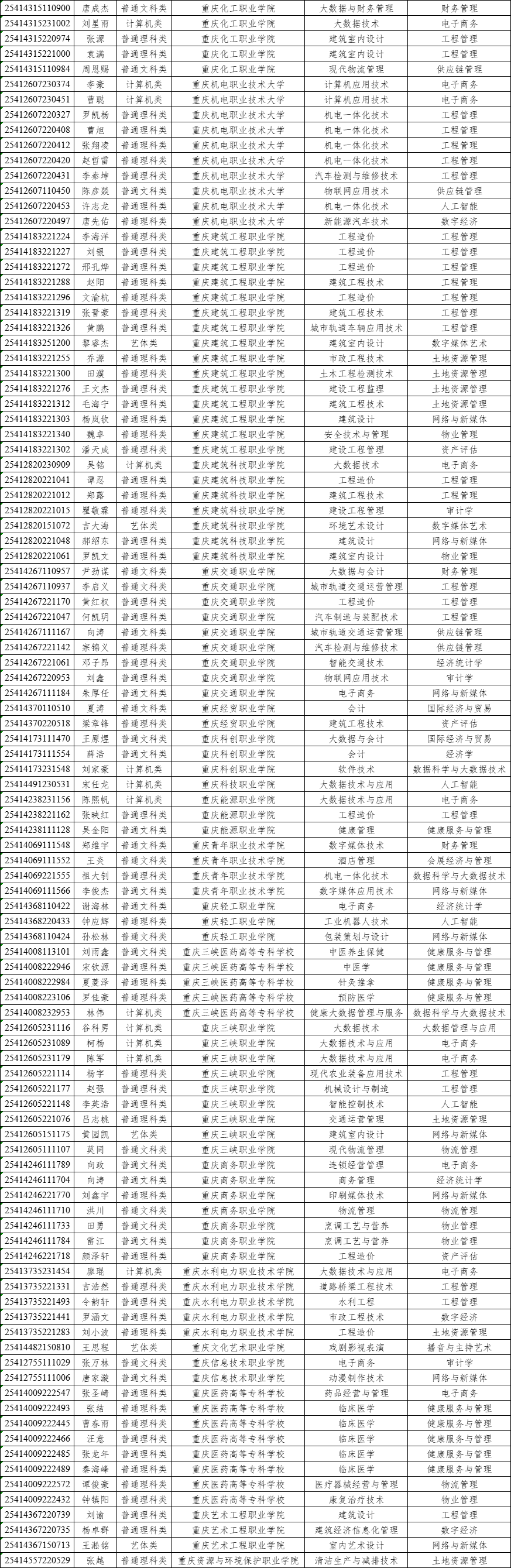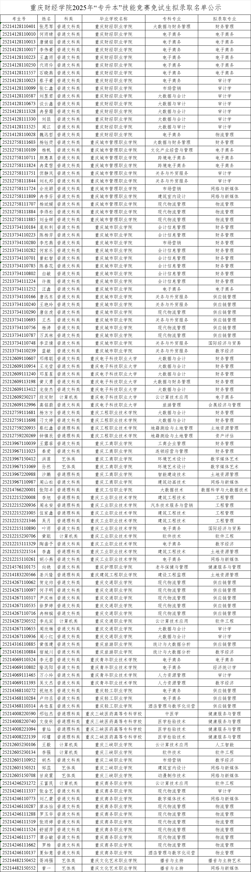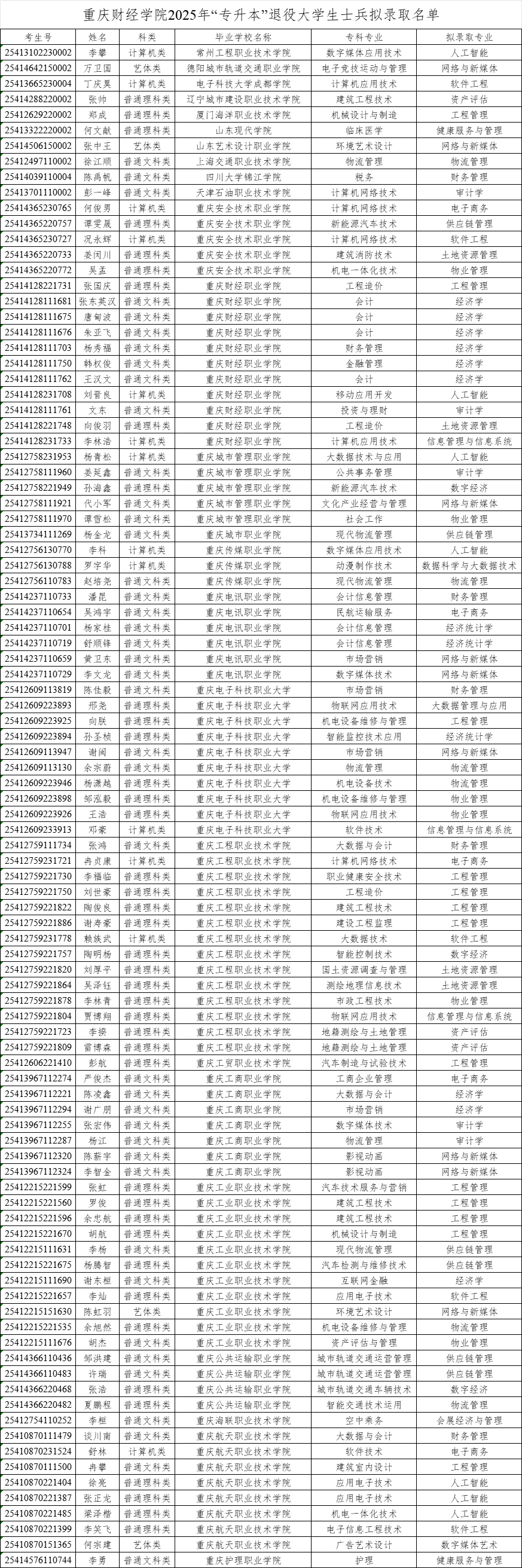 重庆财经学院2025年“专升本”退役大学生士兵及技能免试生拟录取名单公示