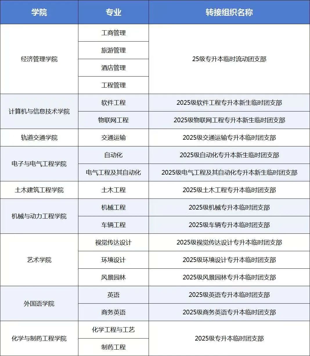 新生团员需登录智慧团建系统进行团关系转接,将本人团关系转至各学院(专业)对应临时团支部,具体信息如下: