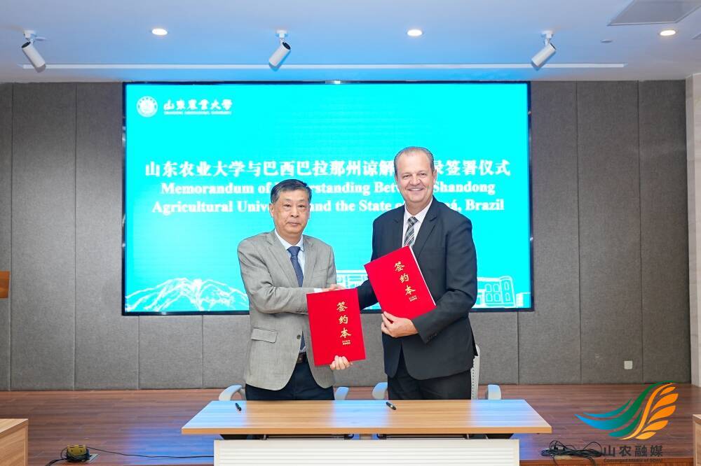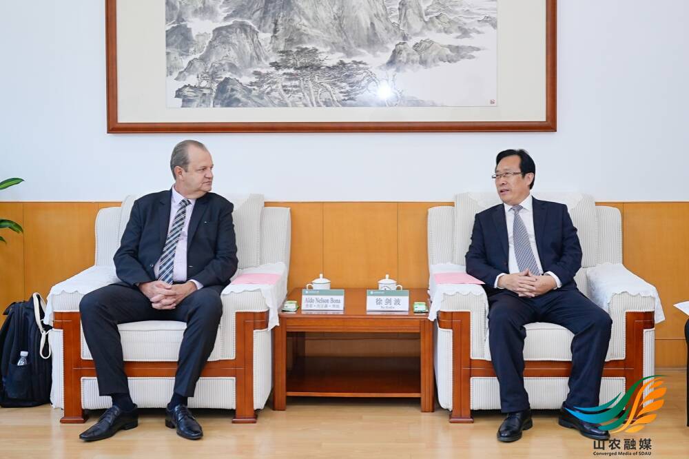 山农融媒5月27日讯5月26日,巴西联邦共和国巴拉那州科技及高等教育厅厅长奥都·内尔森·博纳、匈牙利科学院院士费伦茨·阿科斯·梅斯特哈齐一行来校,就人才培养、平台建设、科研合作等开展深入交流,双方共同签署《山东农业大学与巴西巴拉那州科技及高等教育厅谅解备忘录》。学校党委书记徐剑波会见客人,副校长林海参加座谈交流。