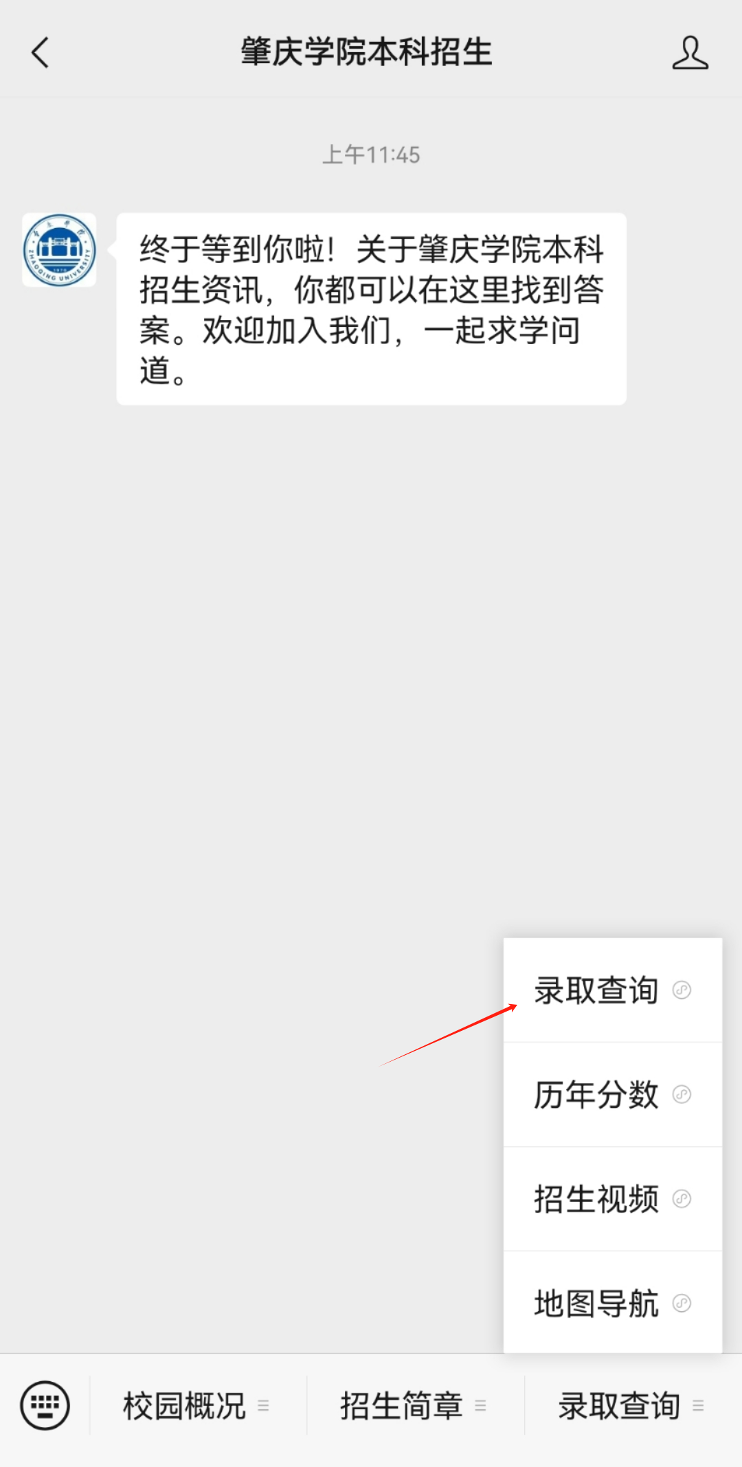 考生可通过关注“肇庆学院本科招生”官方微信公众号,点击“录取查询”栏。