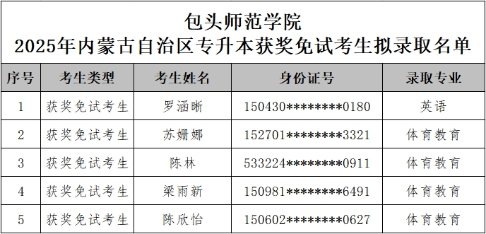 根据自治区教育考试院《2025年内蒙古自治区普通高等教育专升本考试招生录取工作公告》要求,现将我校2025年内蒙古自治区普通高等教育专升本获奖免试考生拟录取结果进行公示,公示期:5月22日-27日,咨询电话:0472-6193071。