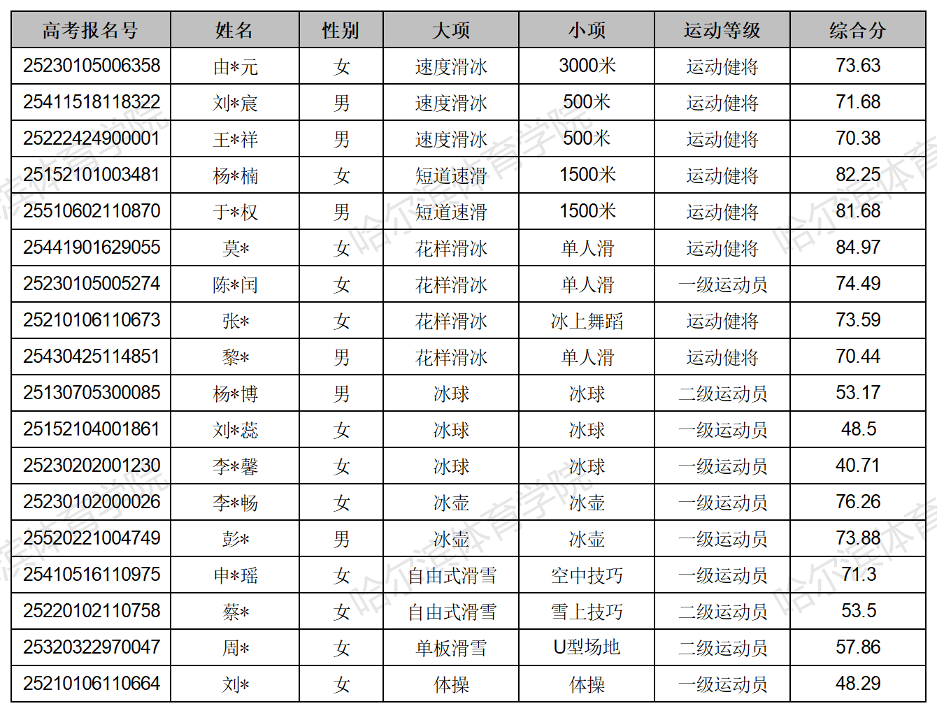 哈尔滨体育学院2025年运动训练专业二志愿拟录取人员名单公示