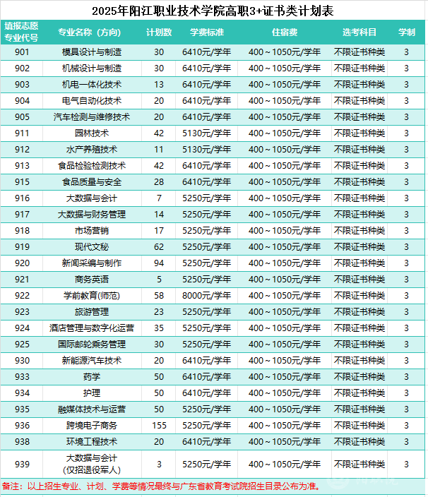 备注:除药学、护理专业办学地点为广东省阳江市卫生学校,其他专业办学地点在阳江职业技术学院。