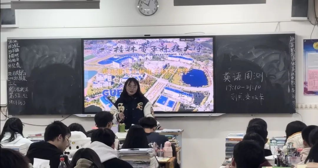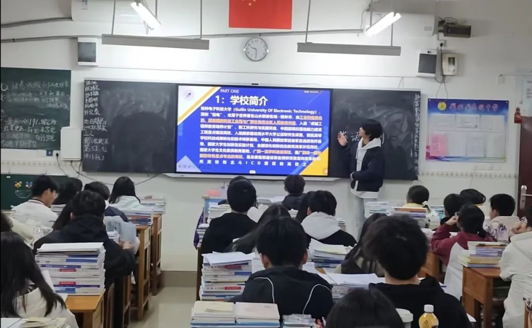 此次活动,我们走进了高中班主任李老师所带的高三班级,采用进班演讲方式,通过分享亲身经历、解读政策等方式,向母校师生详细介绍我校的办学历程,我们团队的PPT展示围绕“吃喝玩乐学”五个方面展开,力求向学弟妹们还原桂林电子科技大学最真实的生活。